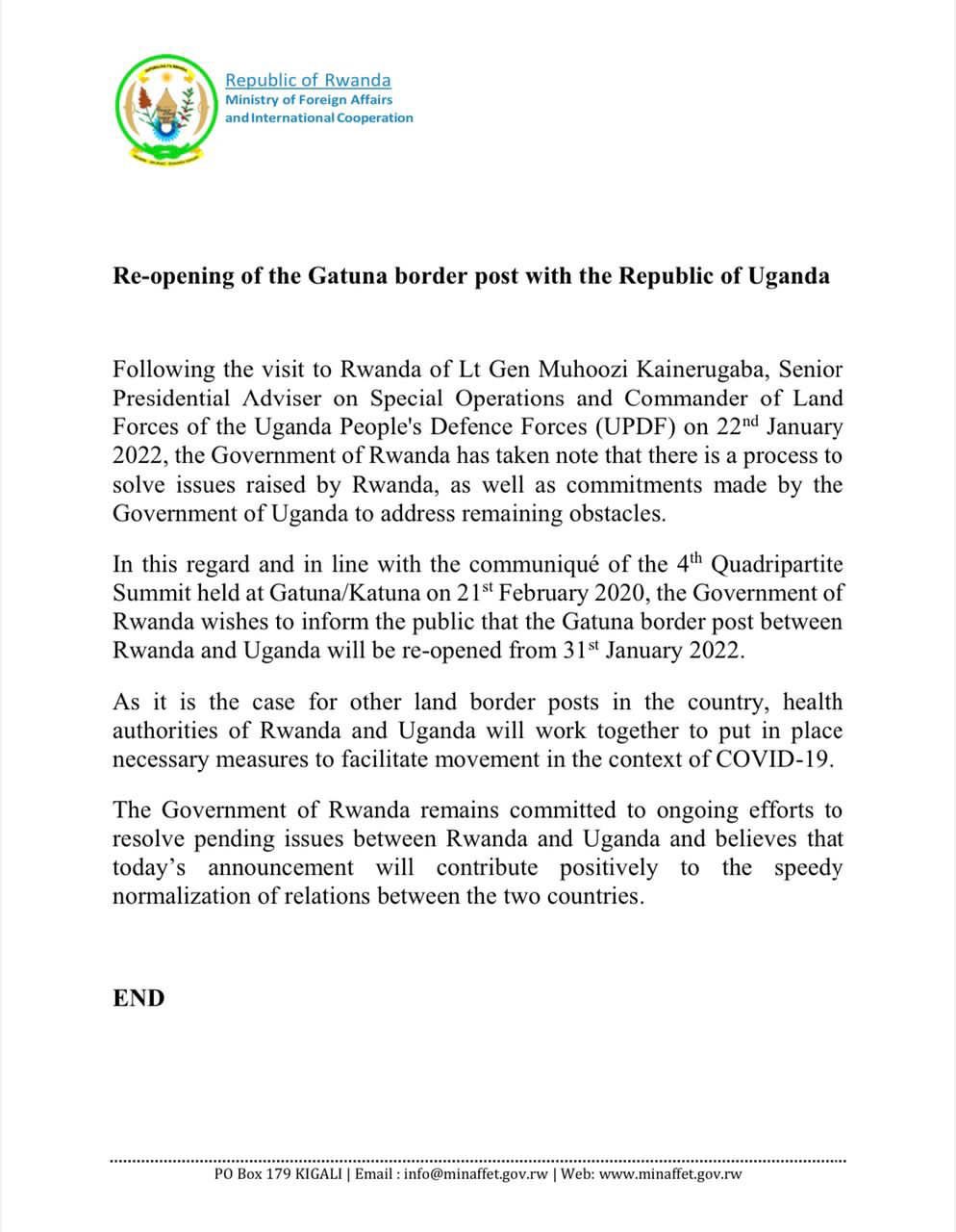 Aya makuru mashya kandi meza ku baturage b'ibihugu byombi yatangajwe mu ijoro rishyira uyu wa Gatanu tariki 28 Mutarama 2022 mu itangazo ryatanzwe na Minisiteri y'Ububanyi n'Amahanga y'u Rwanda. Iyi Minisiteri yavuze ko umupaka wa Gatuna uzafungurwa tariki 31/01/2022.