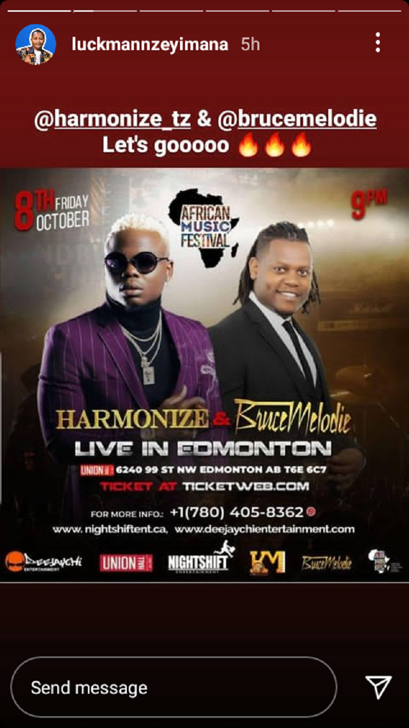 Umuhanzi ukomeje kubaka izina mu muziki mu Rwanda, Bruce Melodie, uherutse no gusinya amasezerano ya Miliyari 1, agiye guhurira ku rubyiniro rumwe na Harmonize mu gitaramo kizabera mu mujyi wa Edmonton wo muri Canada.
