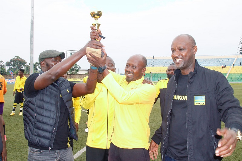 bafana bahaye Canisius igikombe ndetse n’ibahasha irimo amafaranga twamenye ko