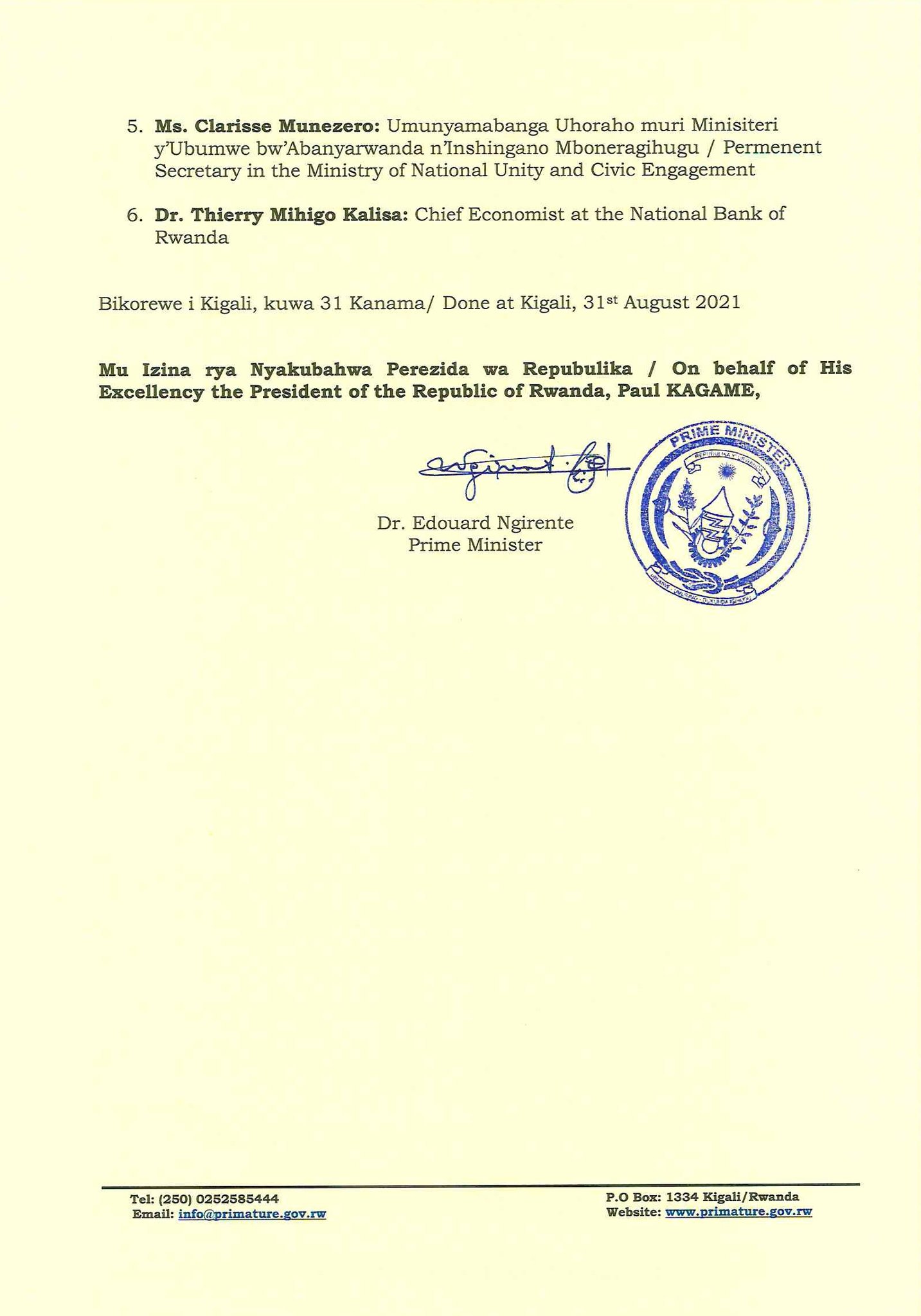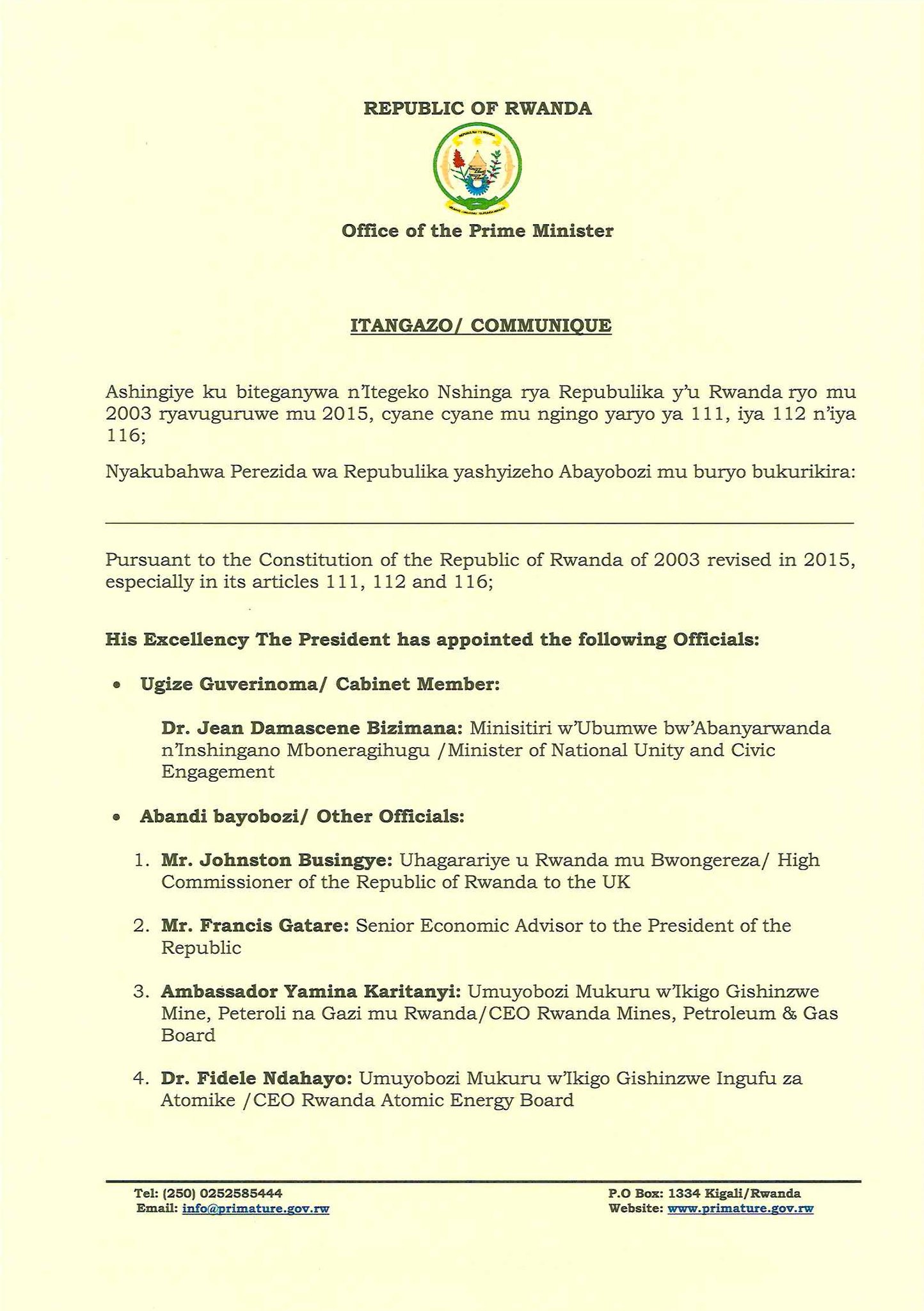 Amakuru y'impinduka muri Guverinoma y'u Rwanda ndetse n'Abayobozi bashya bahawe inshingano n'Umukuru w'Igihugu, yatangarijwe mu itangazo ryaturutse mu Biro bya Minisitiri w'Intebe Dr Edouard Ngirente ari nawe wariteyeho umukono mu izina rya Perezida Paul Kagame.