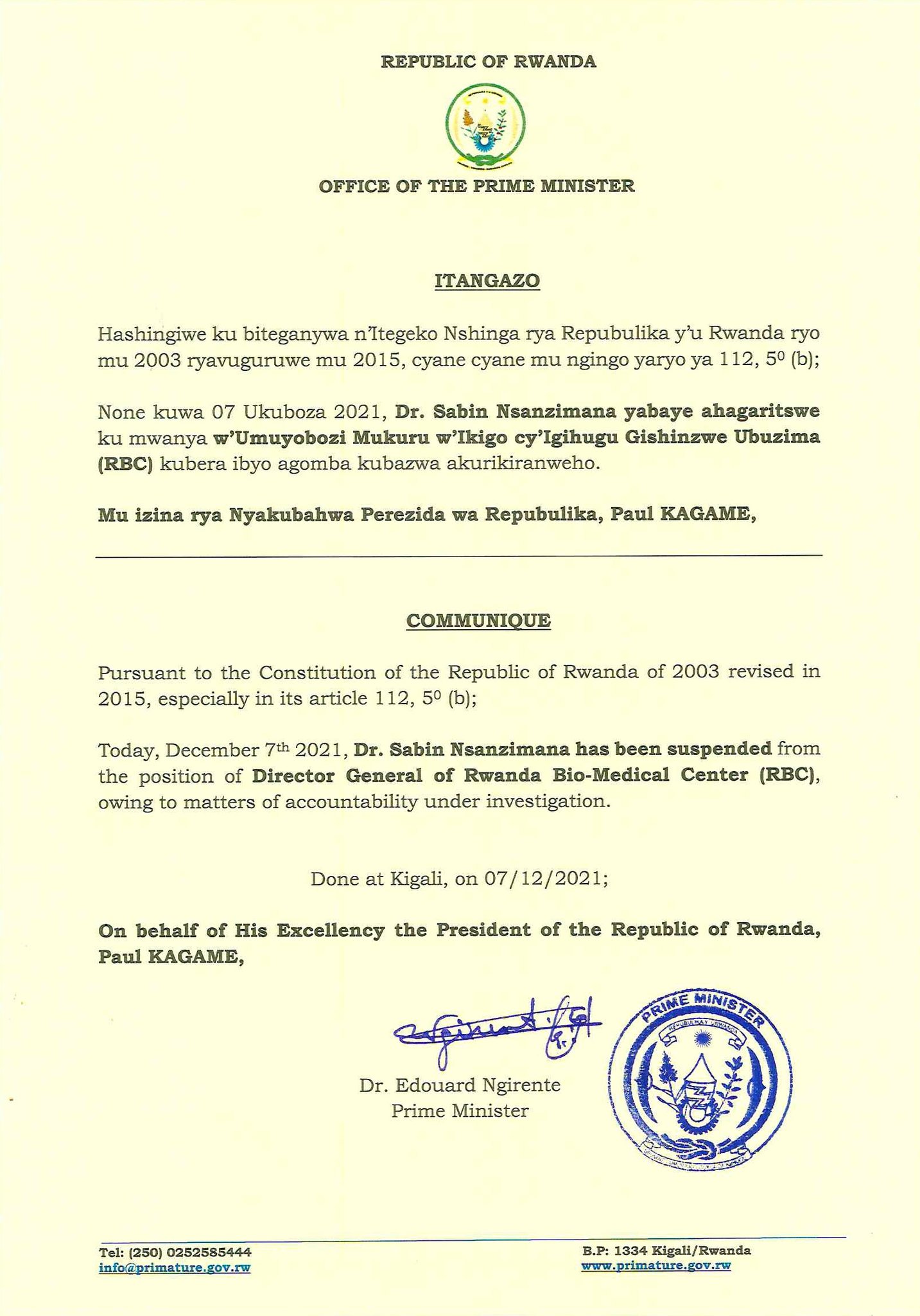 Kuri uyu wa Kabiri tariki 07 Ukuboza 2021, Ibiro bya Minisitiri w'Intebe byasohoye itangazo rivuga ko Dr Sabin Nsanzimana yabaye ahagaritswe ku mwanya w'Umuyobozi Mukuru w'Ikigo cy'Igihugu gishinzwe ubuzima (RBC) kubera ibyo agomba kubazwa akurikiranweho.