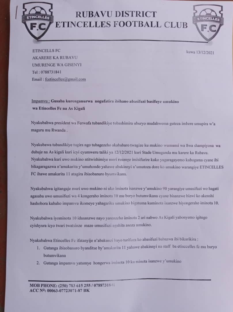 kutavuga rumwe by’umwihariko ku misifurire, aho Etincelles FC yavuze ko yasifuriwe