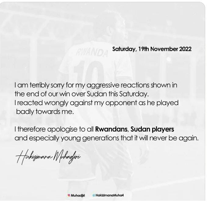 Yagize ati "Ndisegura kubw'imyitwarire y'uburakari nagaragaje nyuma yo gutsinda Sudan kuri uyu wa Gatandatu. Nitwaye nabi ku mukinnyi w'indi kipe wari unkiniye nabi. Ndasaba imbabazi abanyarwanda bose n'abakinnyi ba Sudan by'umwihariko ikiragano cy'abato. Ntibizongera."