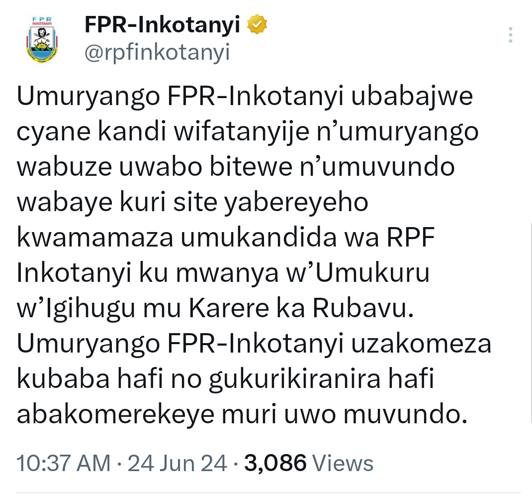 FPR-Inkotanyi ibinyujije ku rubuga rwa X, yagize iti: “Umuryango FPR-Inkotanyi ubabajwe