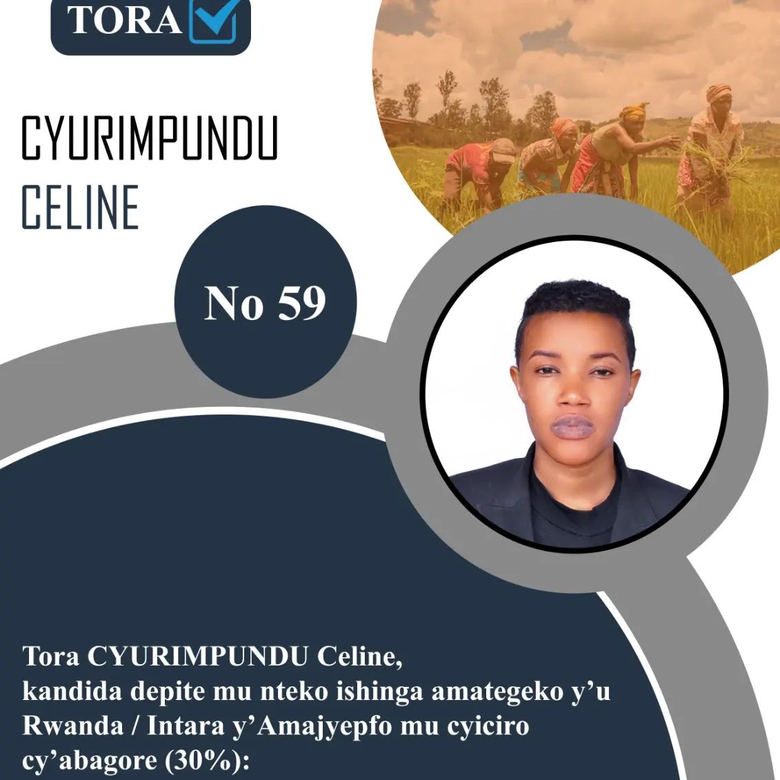 Niwe mukandida Depite muto mu bo bahatanye, aho afite Nimero 59 ari nayo izaba imuranga ku rupapuro rw’itora. Ni umwe mu bahagarariye icyiciro cy’Abadepite 30% bashaka kwinjira mu Nteko Ishinga Amategeko, aho yiyamamarije mu Ntara y’Amajyepfo.
