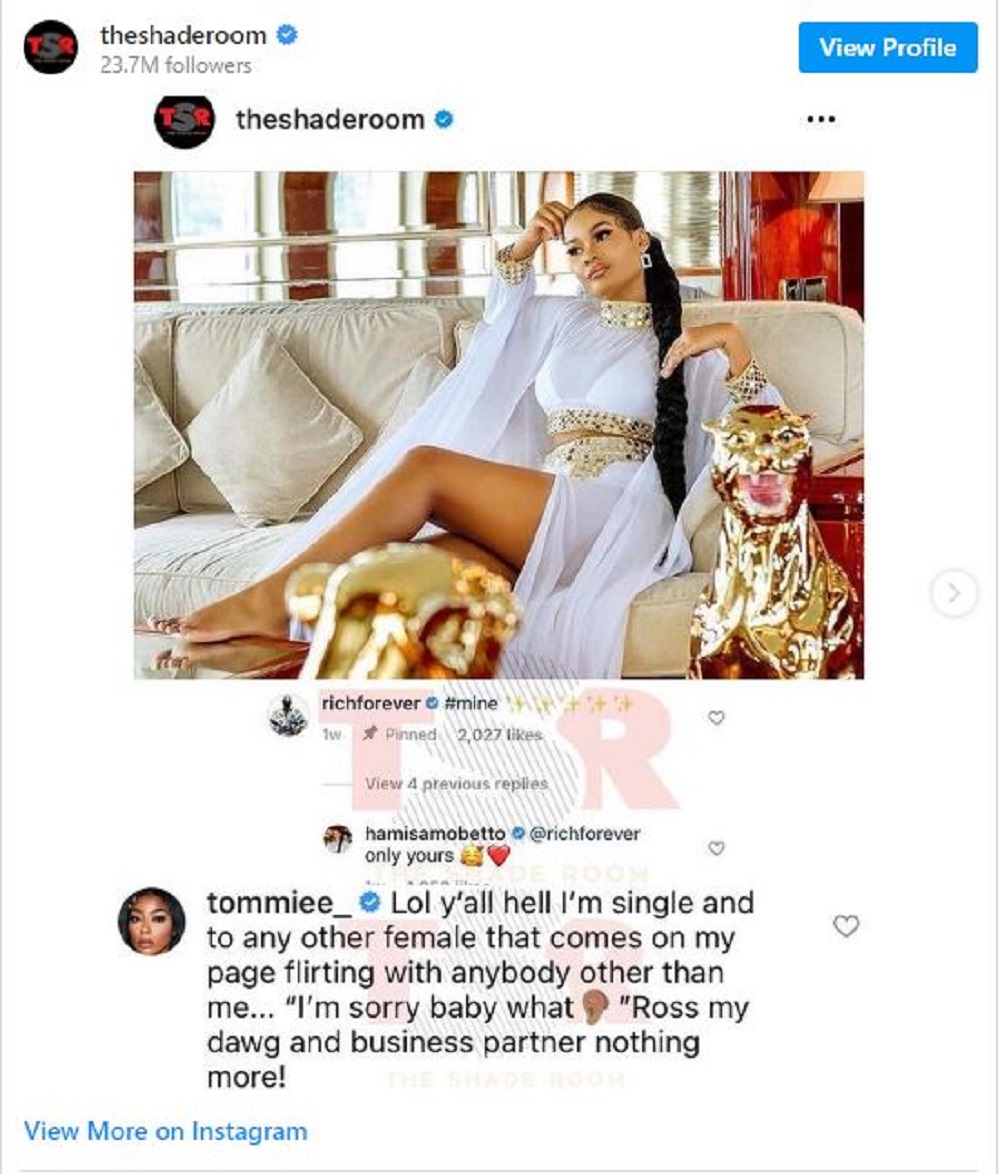 Ku rundi ruhande Tommie we yavuze ko nta rukundo arimo n’umuraperi Rick Ross ahubwo ko bahuzwa n’ubucuruzi. Ibi yabinyujije ku rukuta rwe rwa Instagram, ndetse n’ibinyamakuru bikomeye nka TMZ bibigarukaho.