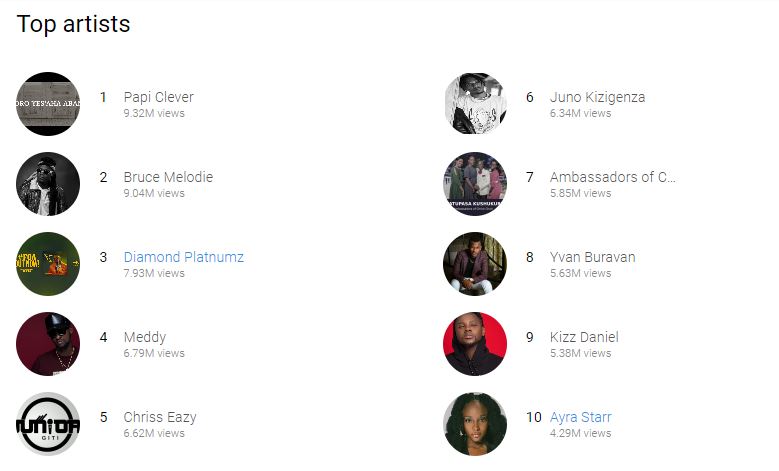 [Miliyoni 5.63], Kizz Daniel [Miliyoni 5.38] na Ayra Starr [Miliyoni 4.29].