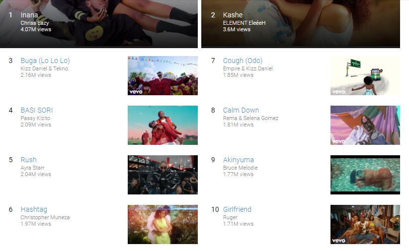 Zirimo Inana ya Chriss Eazzy [Miliyoni4.07], Kashe ya Element [Miliyoni 3.6] Buga ya Kizz Daniel na Tekno [Miliyoni 2.16M], Basi Sori ya Passy Kizito na Chriss Eazy [Milyoni 2.09], Rush ya Ayra Starr [Milyoni 2.04];