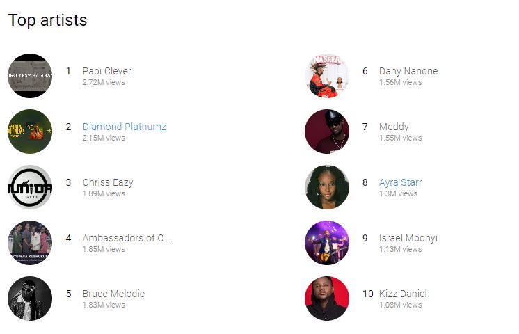 1.3], Israel Mbonyi [Milyoni 1.13] na Kizz Daniel [Milyoni 1.08].