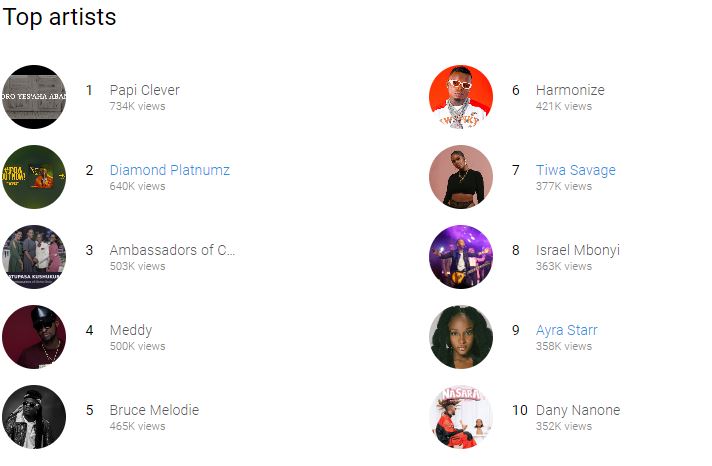 565], Harmonize [Ibihumbi 421], Tiwa Savage [Ibihumbi 377], Israel Mbonyi [Ibihumbi