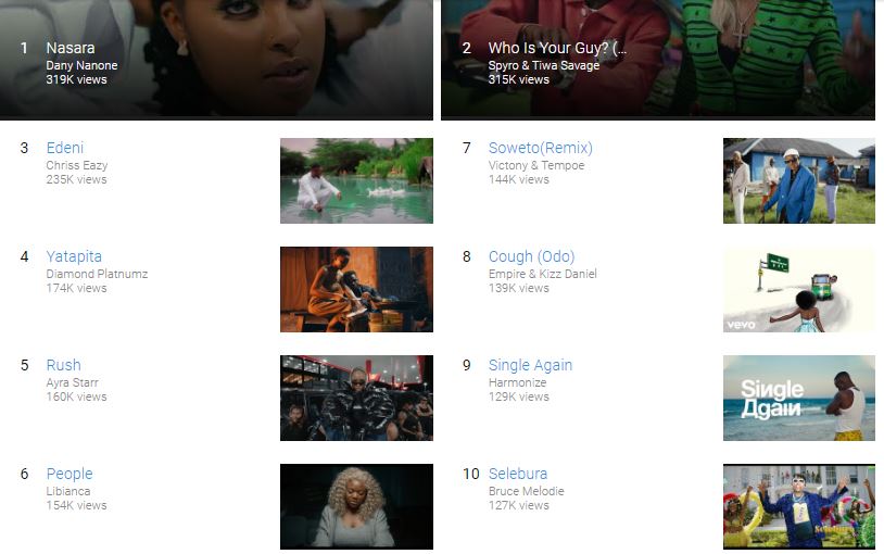 Tiwa Savage [315], Edeni ya Chriss Eazy [235], Yatapita ya Diamond Platnumz [174],