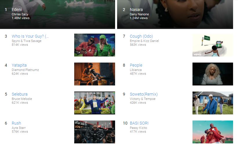 Edeni ya Chrissy Eazy [Miliyoni 1.48], Nasara ya Danny Nanone [Miliyoni 1.24], Who Is Your Guy ya Spyro na Tiwa Savage [Ibihumbi 814], Yatapita ya Diamond [Ibihumbi 624], Selebura ya Bruce Melodie [Ibihumbi 621];