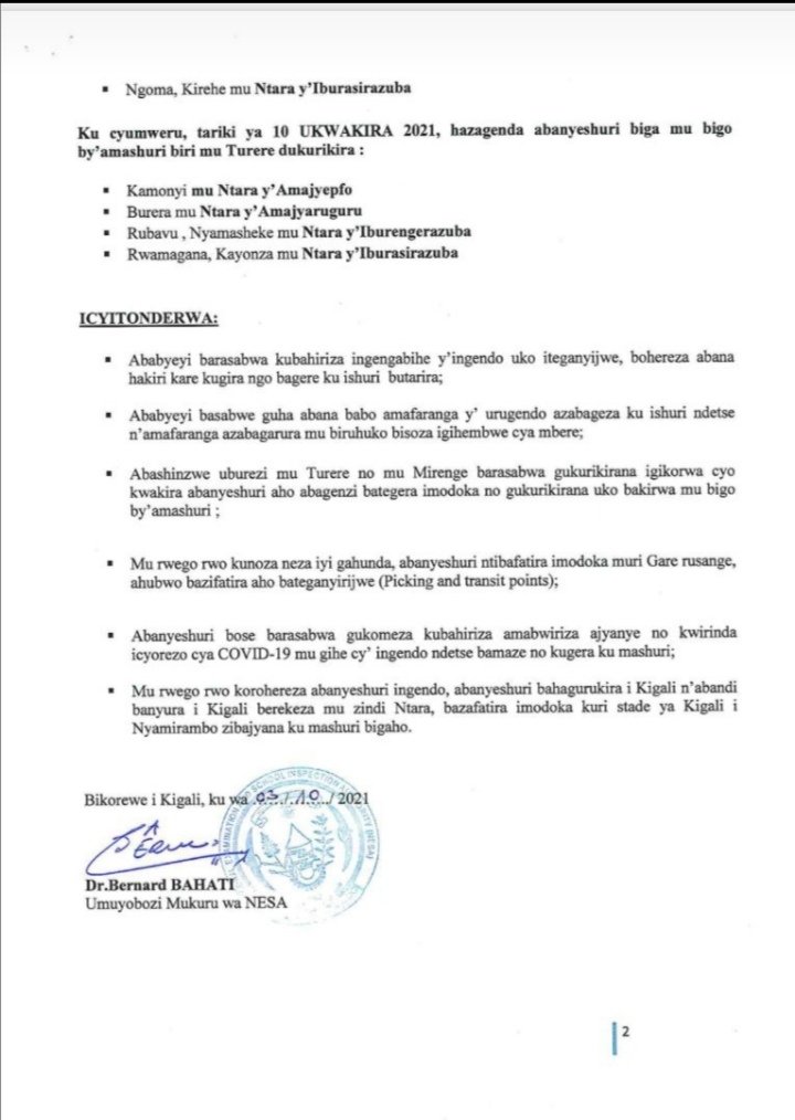 Itangazo ryashyizweho umukono n'Umuyobozi Mukuru wa NESA, Dr. Bernard Bahati, rivuga ko 'Mu rwego rwo korohereza abanyeshuri ingendo, abanyeshuri bahagurukira i Kigali n'abandi banyura i Kigali berekeza mu zindi Ntara bazafatira imodoka kuri stade ya Kigali i Nyamirambo zibajyana ku mashuri bigaho.