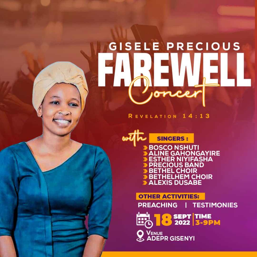 Iki gitaramo cyiswe "Gisele Precious Farewell Concert" kiraba kuri iki Cyumweru tariki 18 Nzeri 2022 kuva saa cyenda z'amanywa kugeza saa tatu z'ijoro. Kirabera kuri ADEPR Gisenyi. Kiraza kuririmbamo abahanzi nka Alexis Dusabe, Bosco Nshuti, Aline Gahongayire, Esther Niyifasha, Precious Band, Bethel choir na Bethlehem choir. Haraza gutangirwamo ubuhamya ndetse n'ijambo ry'Imana.
