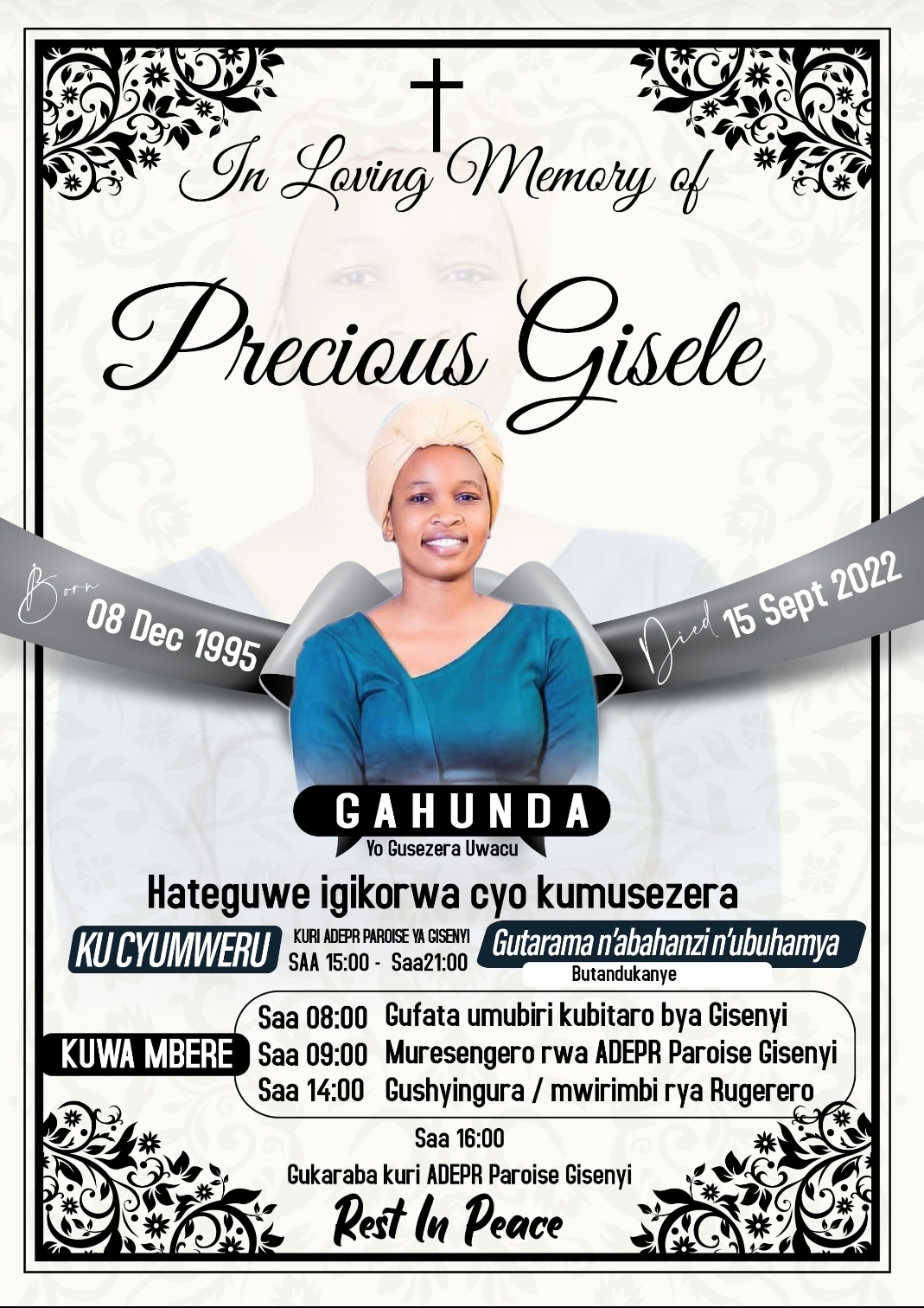 Kuwa Mbere ariki 19 Nzeri 2022 ni bwo Gisele Precious azashyingurwa. Saa mbiri zuzuye za mu gitondo ni ugufata umubiri we ku bitaro bya Gisenyi, saa tatu zuzuye bakomereze mu rusengero rwa ADEPR Paroise Gisenyi, hanyuma saa munani zuzuye habe umuhango wo kumushyingura mu irimbi rya Rugerero. Gukaraba bizabera kuri ADEPR Paroise Gisenyi.