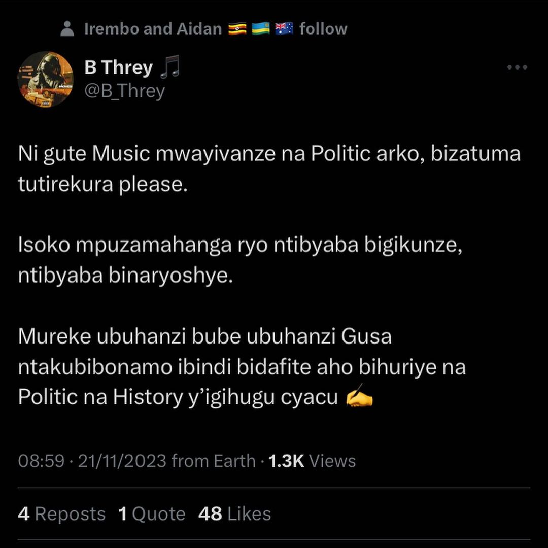 Uyu muhanzi yifashishije imbuga ze nkoranyambaga yagize ati:" Ni gute Muzika  mwayivanze na Politiki ariko, Bizatuma tutirekura. Isoko mpuzamahanga byo ntibyaba bigikunze, ntibyaba binaryoshye".