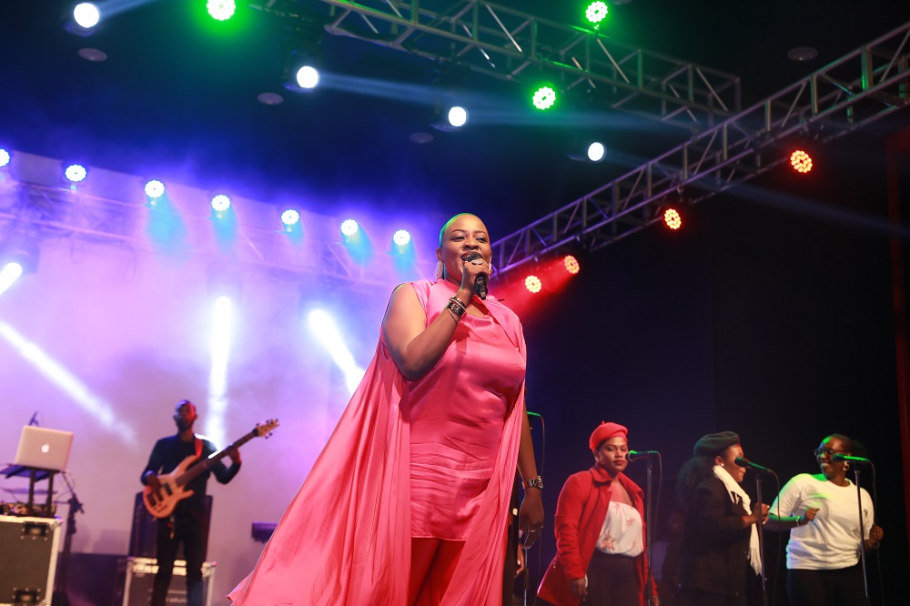 Aline Gahongayire yagiye ku rubyiniro hafi nyuma y’isaha igitaramo gihagaze
