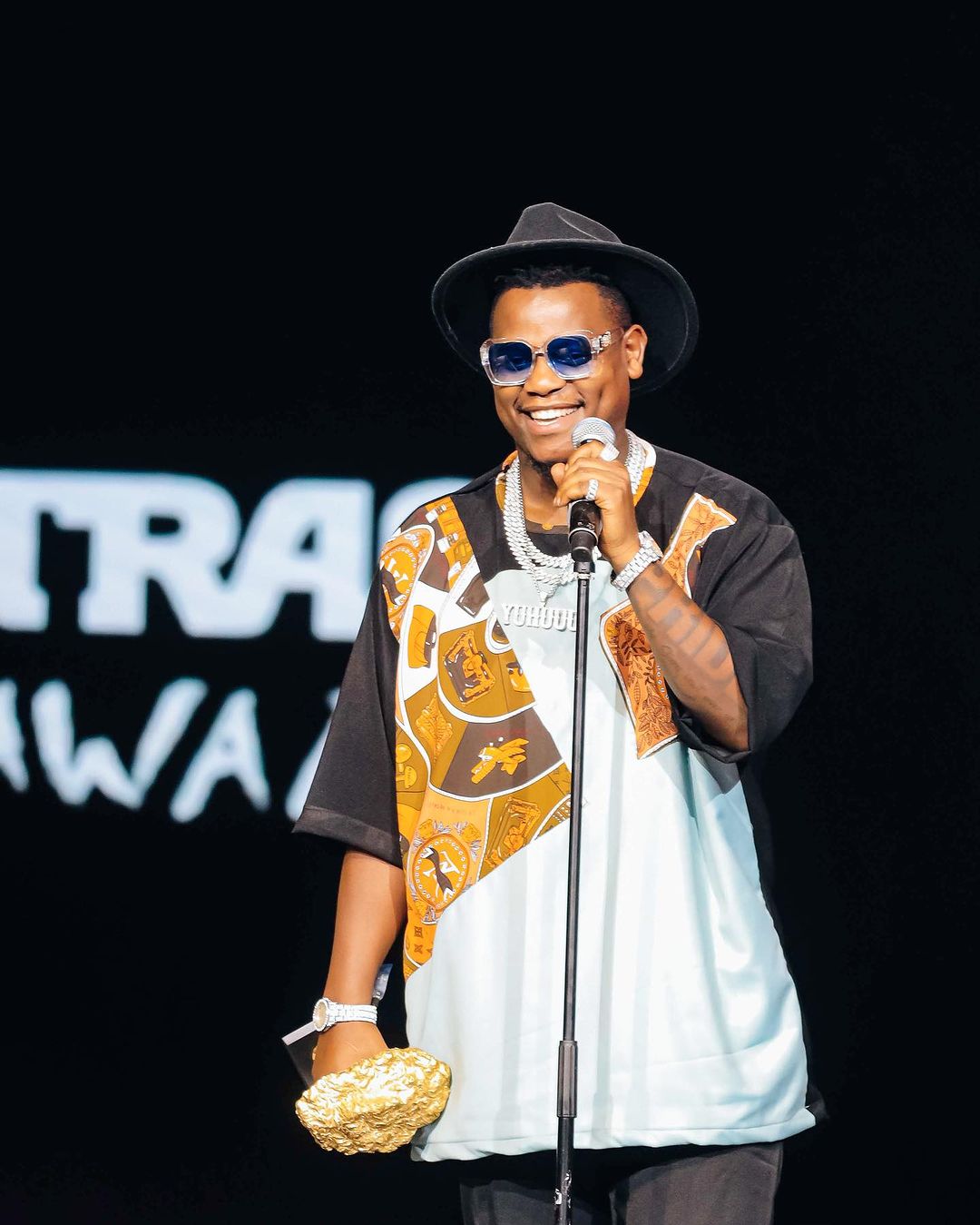 Ubwo Bruce Melodie yashyikirizwaga igihembo yegukanye muri Trace Awards na Sandrine Isheja hamwe na Cheymuv
