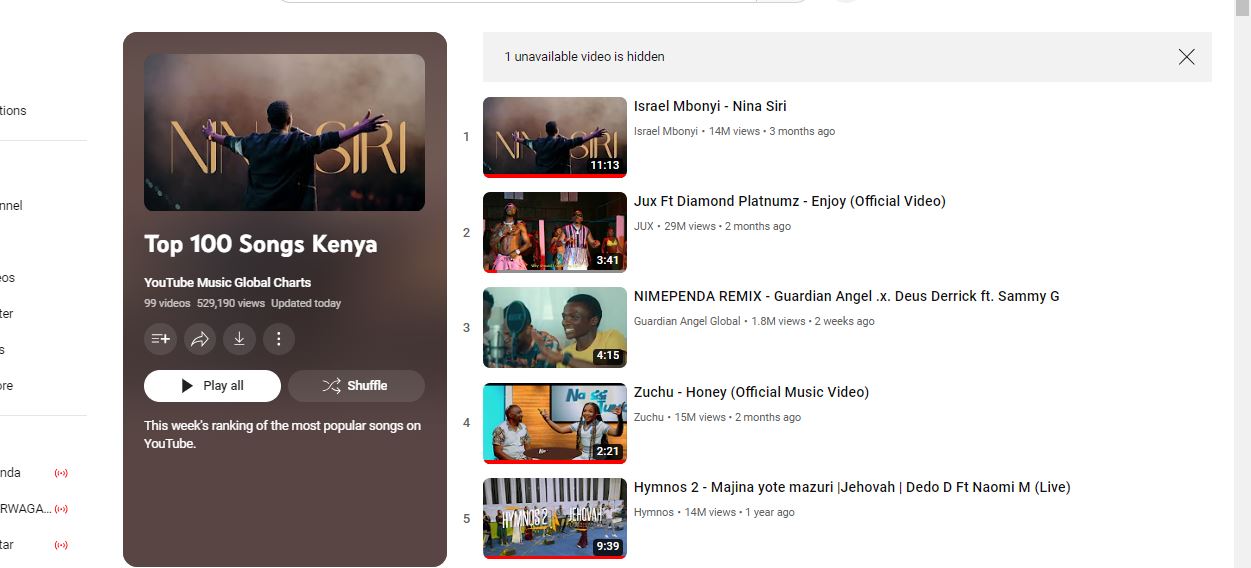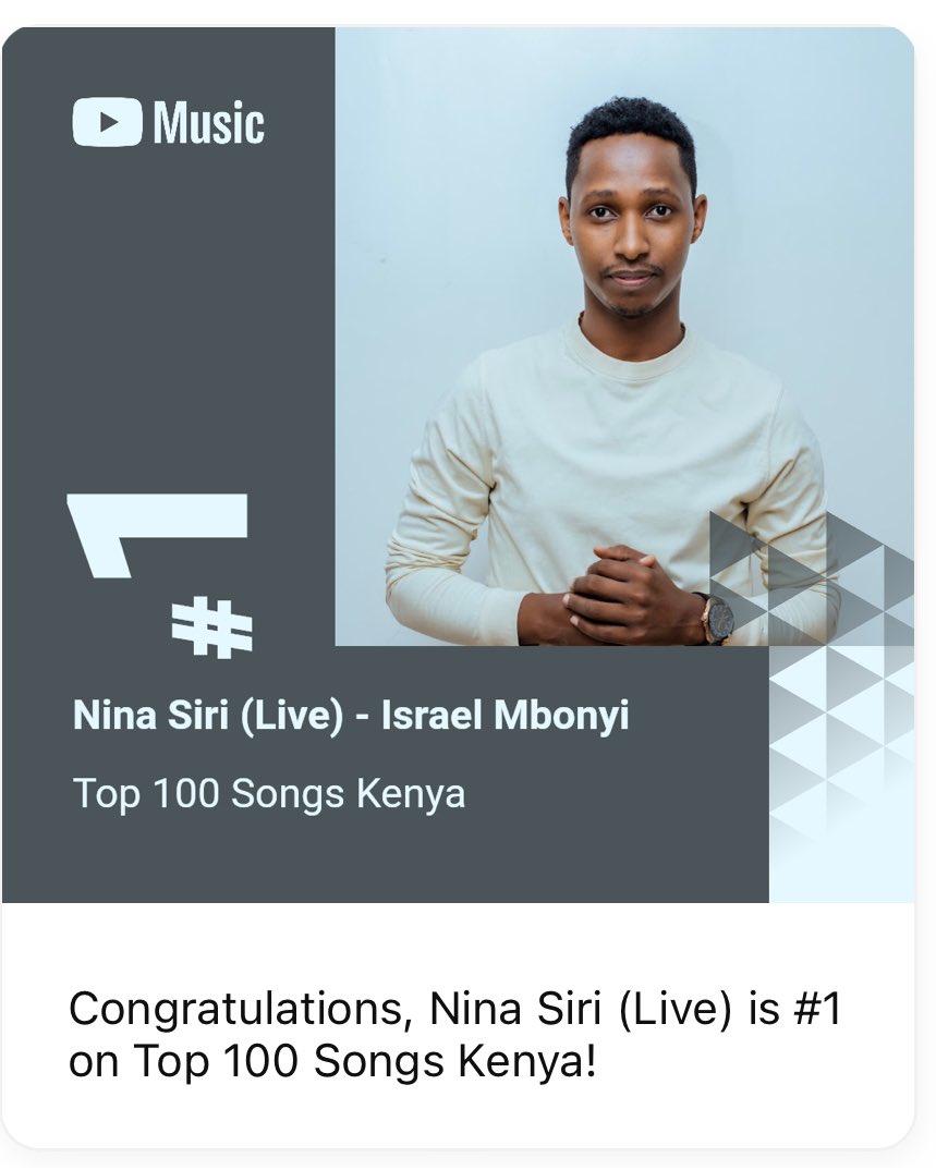 Indirimbo ‘Nina Siri’ y’umuhanzi w’indirimbo zo kuramya no guhimbaza Imana, Israel Mbonyi yaje ku mwanya wa mbere mu ndirimbo zikunzwe mu gihugu cya Kenya ivuye ku mwanya wa Gatatu yari imazeho igihe.