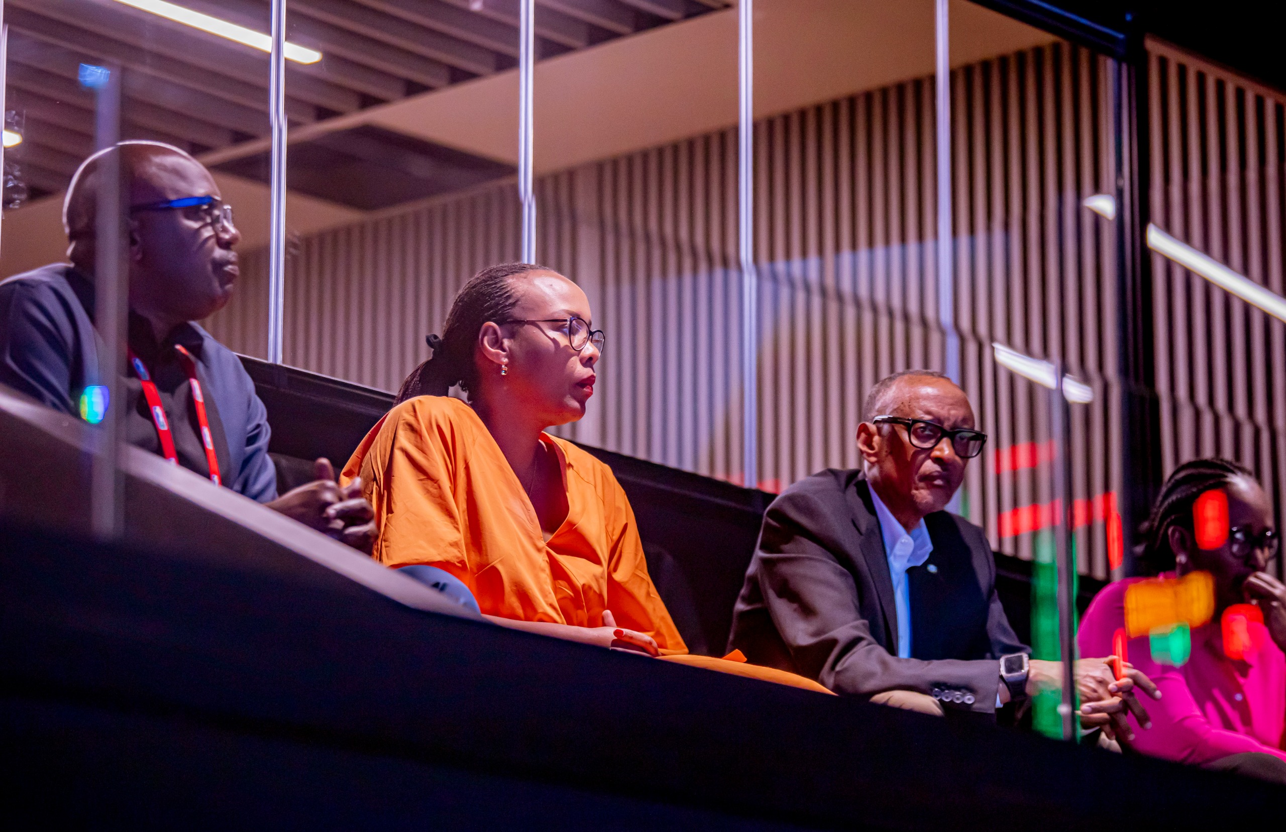 Perezida Kagame na Madamu Jeannette Kagame hamwe na Minisitiri wa Siporo Aurore Mimosa bitabiriye imikino ya BAL
