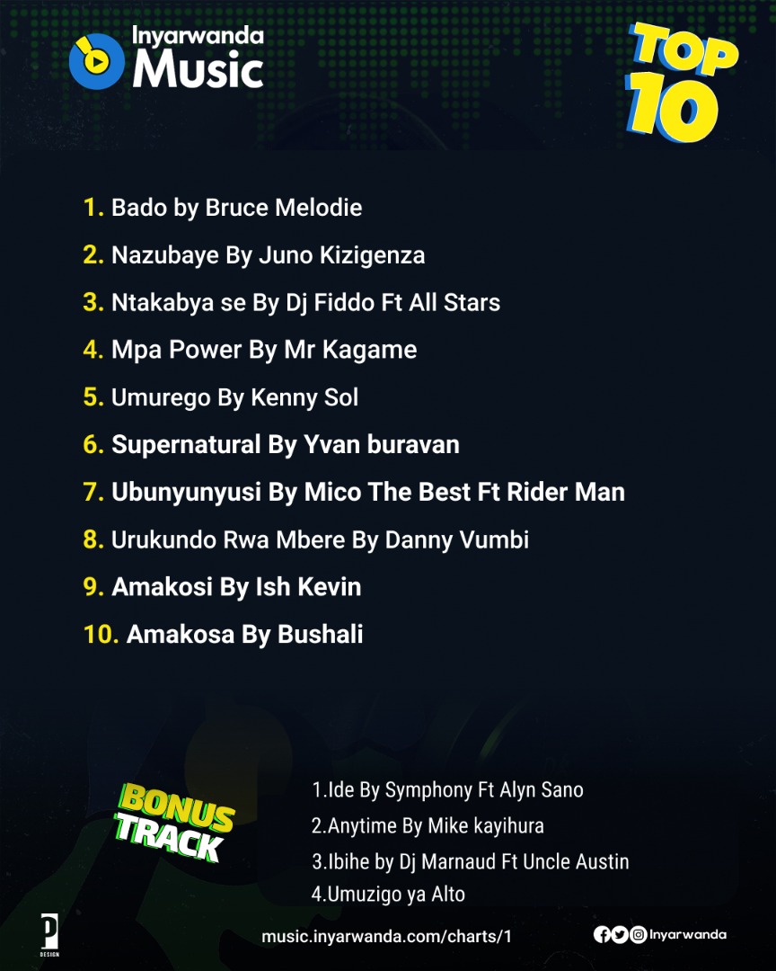 Indirimbo 10 mwitoreye zikunzwe cyane muri iki cyumweru ziyobowe n'indirimbo ya Bruce Melodie yitwa 'Bado' ndetse n'indi yitwa 'Nazubaye' ya Juno Kizigenza ubarizwa muri Label ya Bruce Melodie n'ubundi izwi ku izina ry'Ibitangaza.