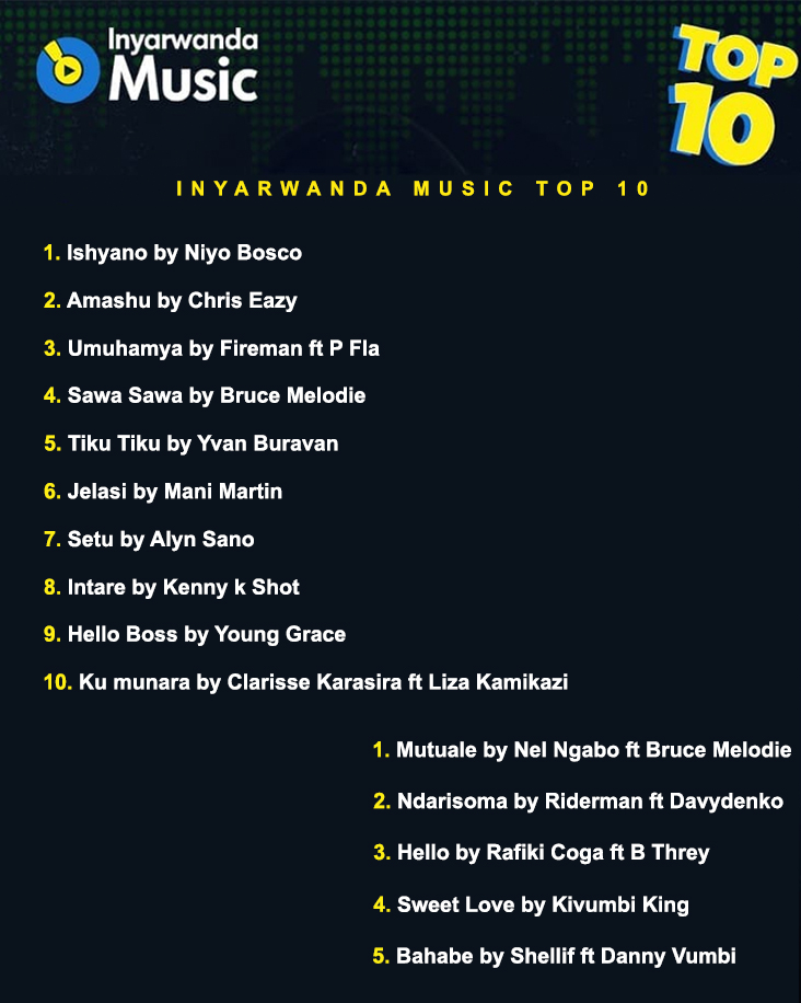 Mu gukora uru rutonde (InyaRwanda Music Top 10), twabanje gushyira ku mbuga nkoranyambaga zacu indirimbo 15 aho buri mukunzi w’umuziki nyarwanda yasabwaga guha ijwi rimwe indirimbo ari gukunda cyane. Ni ko byagenze kuko buri umwe yerekanye indirimbo iri kumuryohera cyane.