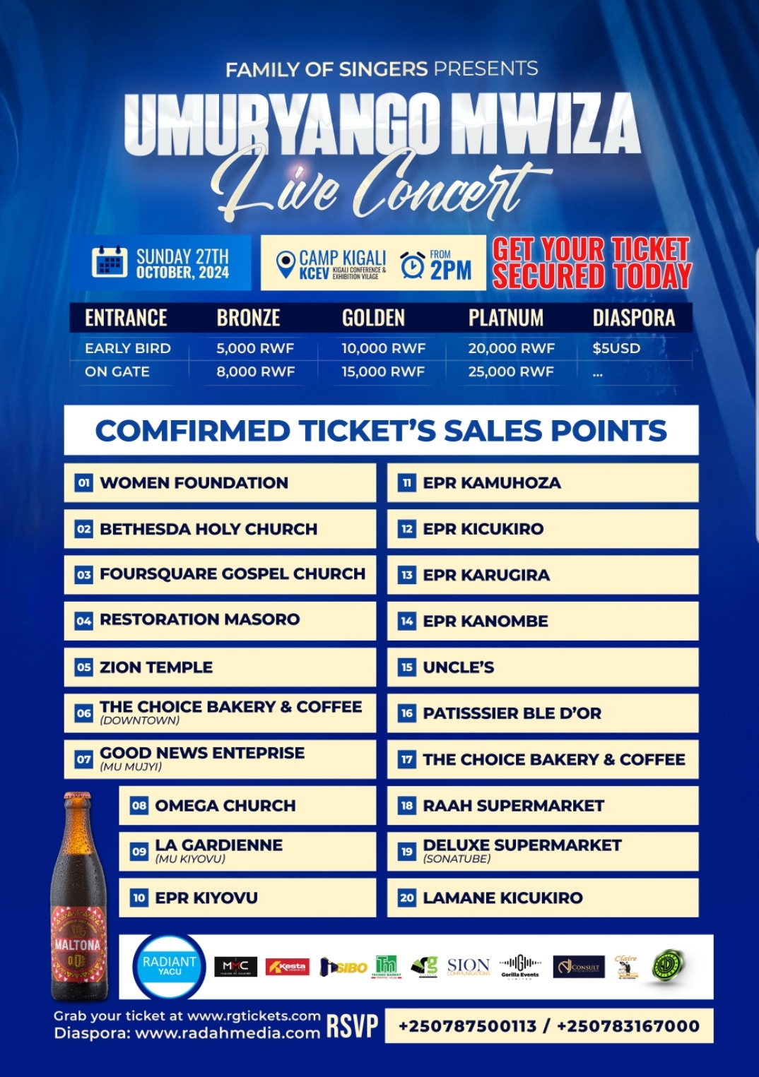 EPR Kicukiro, EPR Karugira, EPR Kanombe, RAAH Super Market, Deluxe Super Market na La Mane Kicukiro. Ushobora kugura itike mu buryo bw’ikoranabuhanga unyuze kuri: www.rgticket.com mu gihe abadiaspora bashobora kugura tike banyuze kuri: www.radahmedia.com.