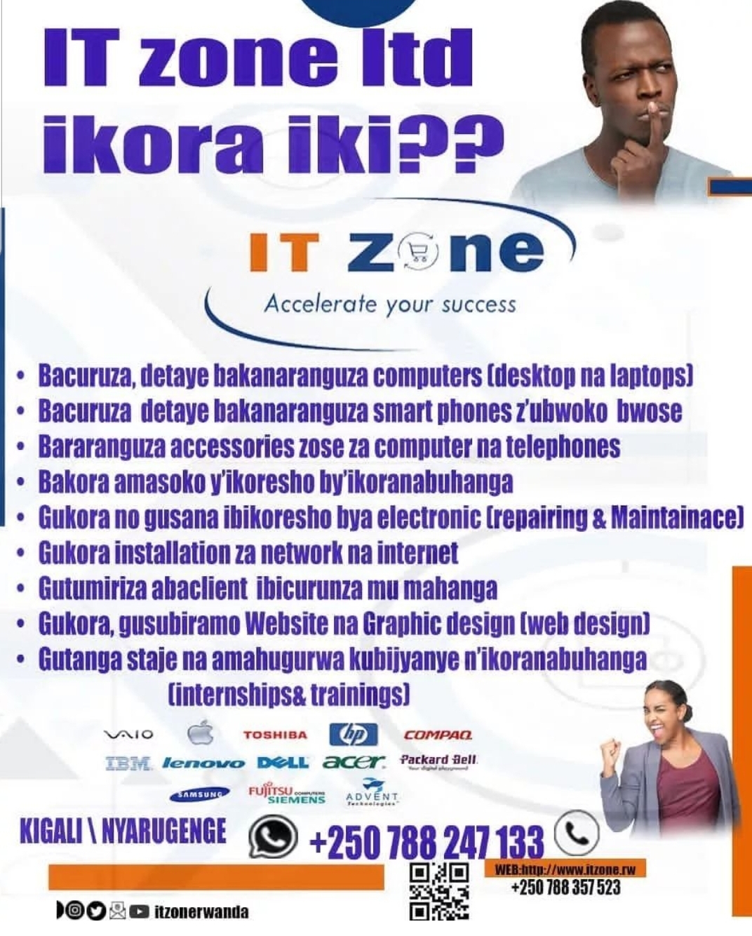 Niba ushaka igikoresho cy'ikoranabuhanga, kugikoresha cyangwa kugirwa inama z'uko wakoresha ibikoresho byawe birimo mudasobwa, computer n'ibindi, gana IT Zone baragufasha. Ushobora kuvugana na IT zone binyuze ku mbuga nkoranyambaga zabo zitandukanya harimo Instagram aho bitwa itzone_Rwanda ndetse na twitter "itzone_Rwanda " cyangwa ugahamage iyi nimero yabo +250788247133/+25078357523 wanabasura kuri website yabo: www.Itzone.rw