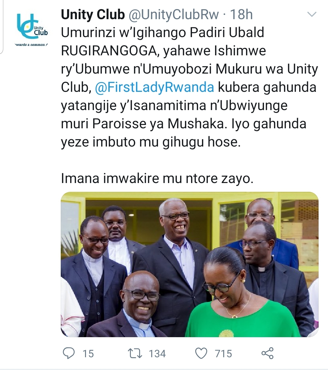 Ku rukuta rwa Twitter rwa Unity Club, bagize bati: "Umurinzi w’Igihango Padiri Ubald Rugirangoga, yahawe Ishimwe ry’Ubumwe n'Umuyobozi Mukuru wa Unity Club, First Lady Rwanda (Jeannette Kagame), kubera gahunda yatangije y’Isanamitima n’Ubwiyunge muri Paroisse ya Mushaka. Iyo gahunda yeze imbuto mu gihugu hose. Imana imwakire mu ntore zayo".