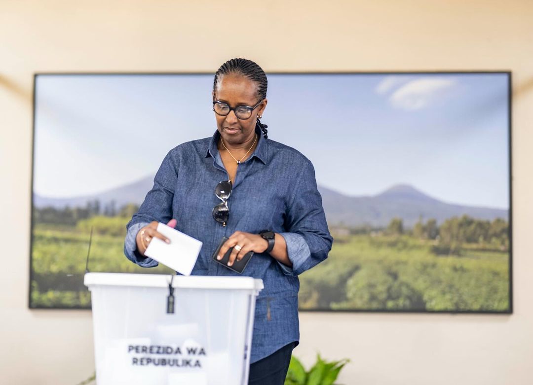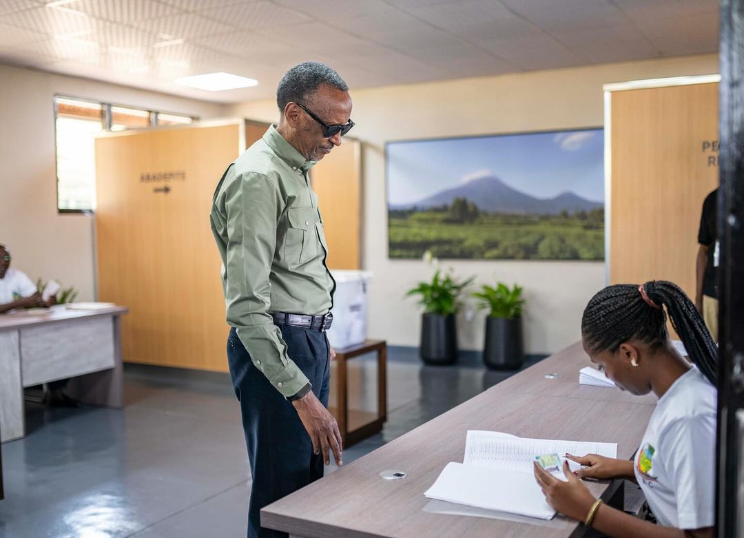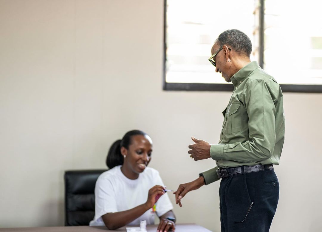 Ange Kagame n'umugabo we Bertranda Ndengeyingoma nabo babanje gutegereza Paul Kagame na Madamu Jeannette Kagame babanje gusuhuza abo basanze ubwo bari bategereje gutoraPerezida Kagame yabanje kwerekana ibyangombwa anasoje ashyirwaho ikimenyetso cy'uko yatoyeKandida-Perezida Paul Kagame na Madamu Jeannette Kagame batoye mu matora akomatanije y'Umukuru w'Igihugu n'ay'Abadepite