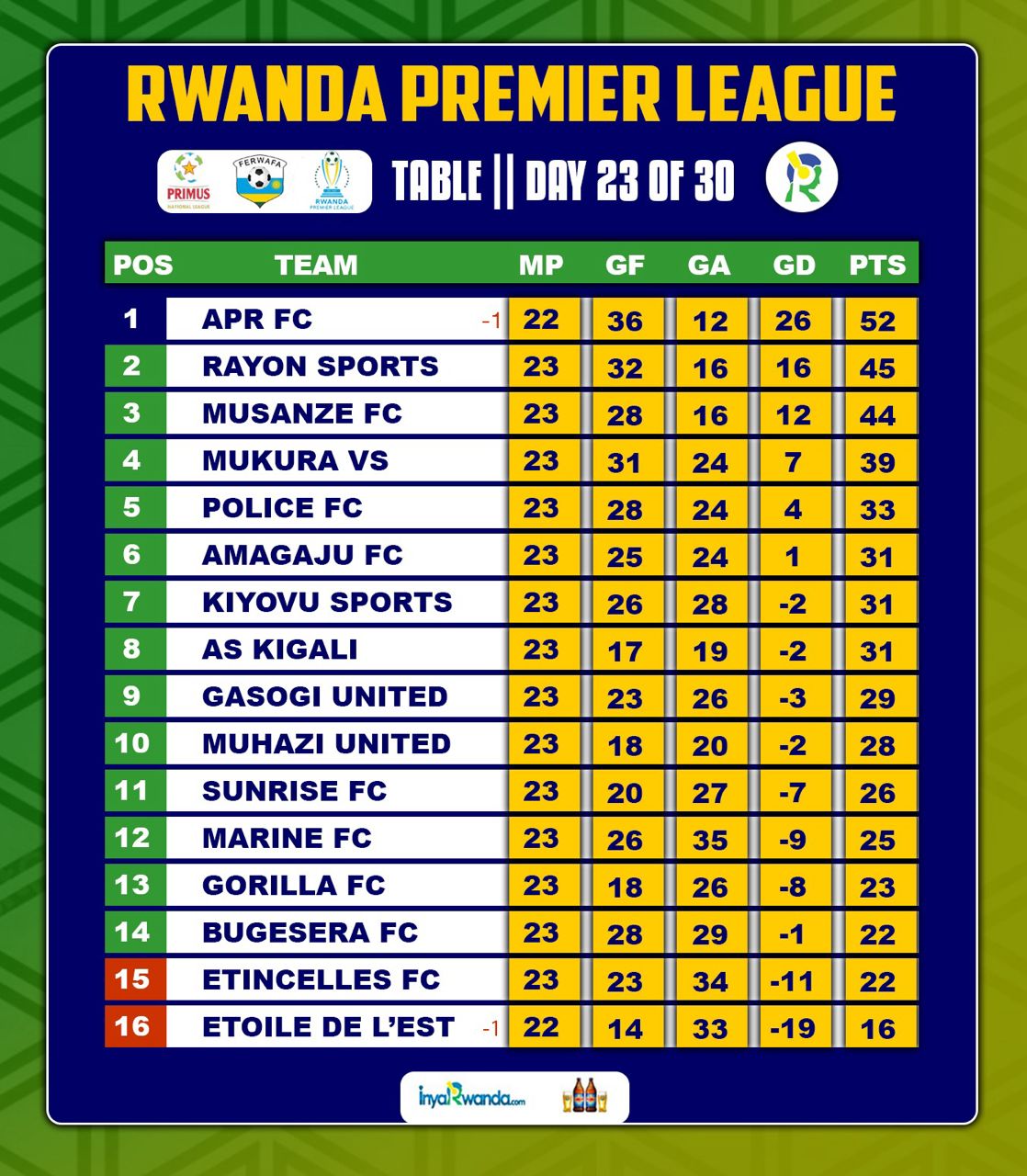 Uku niko urutonde rwa shampiyona ruhagaze ku munsi wa 23