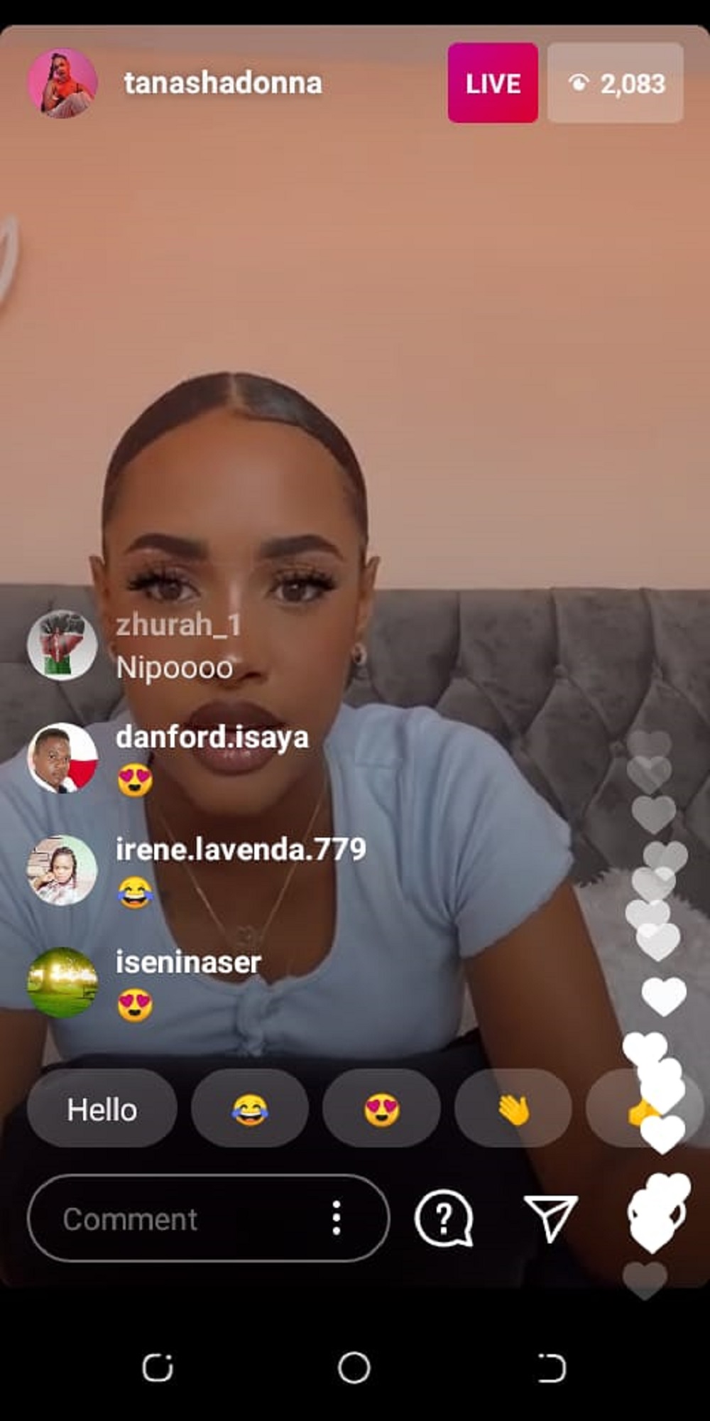 Kuri uyu wa Kane tariki 18 Gashyantare ku gicamunsi ni bwo Tanasha Dona yaganiriye n'abakunzi be [Live] ku rukuta rwe rwa instagram. Ku bakunzi be wabaye umwanya mwiza wo gushira amatsiko kuri iki cyamamare, kuko yabahaye umwanya wo kumubaza ibibazo bifuza maze akagenda ibisubiza.