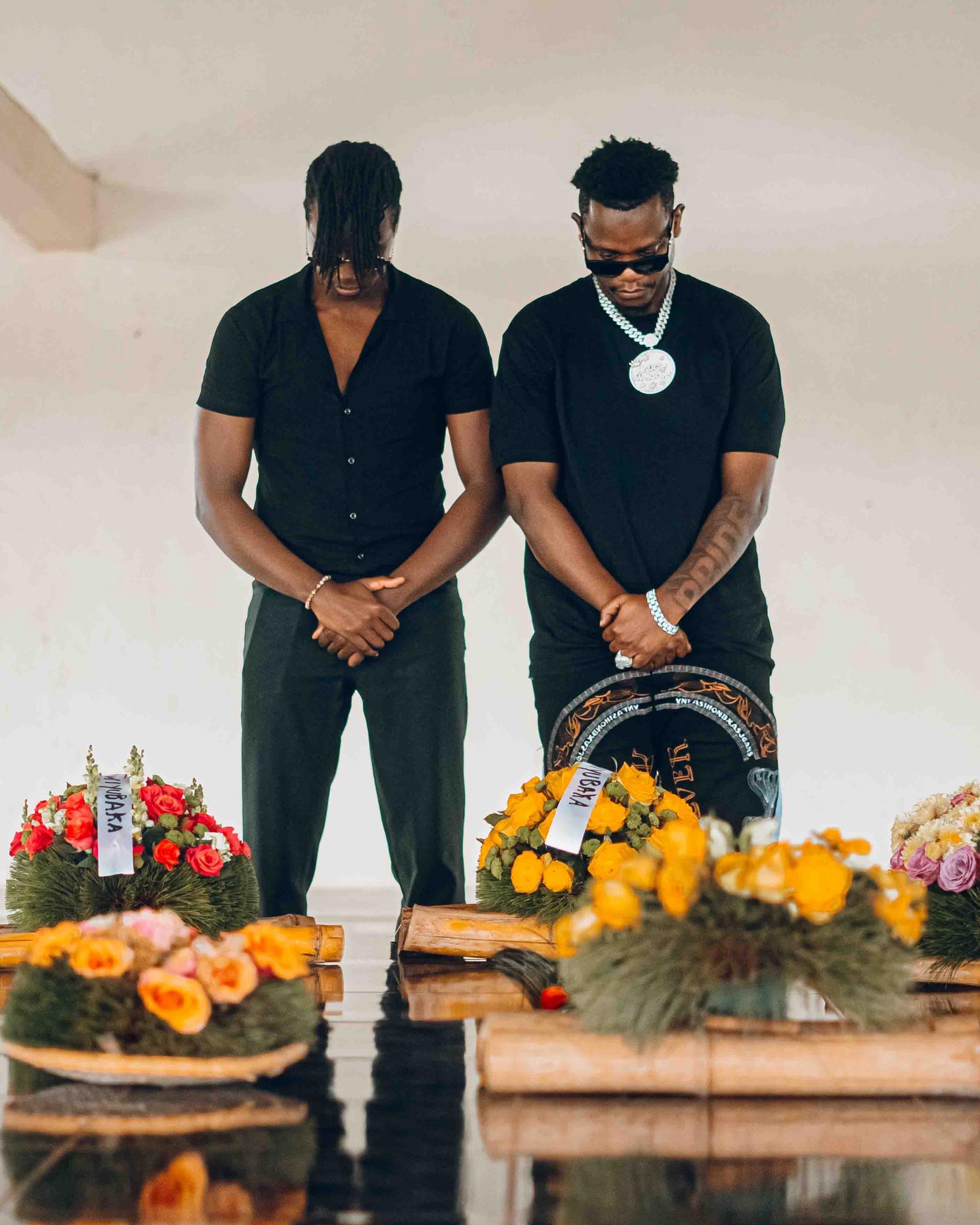 Ross Kana na Bruce Melodie bafashe umwanya wo kunamira inzirakarengane zishyinguye mu rwibutso rwa Jenoside rw'Akarere ka Nyanza