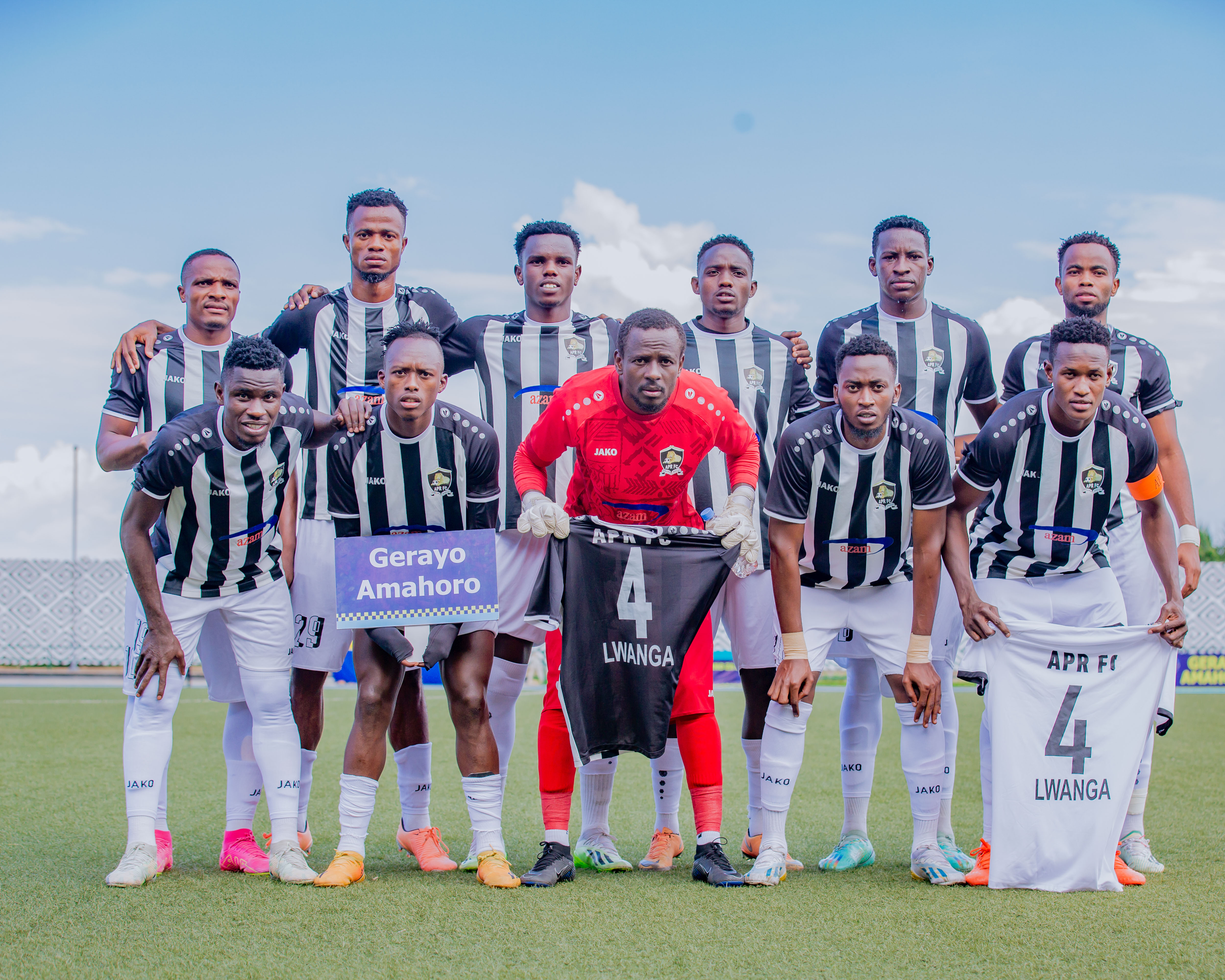 14:59' Mbere yuko umukino utangira abakinnyi ba APR FC bifotozanyije umwenda wa Thadeo Luanga wapfushije se umubyara kuri uyu wa mbere mu rwego rwo gukomeza kumwihanganisha