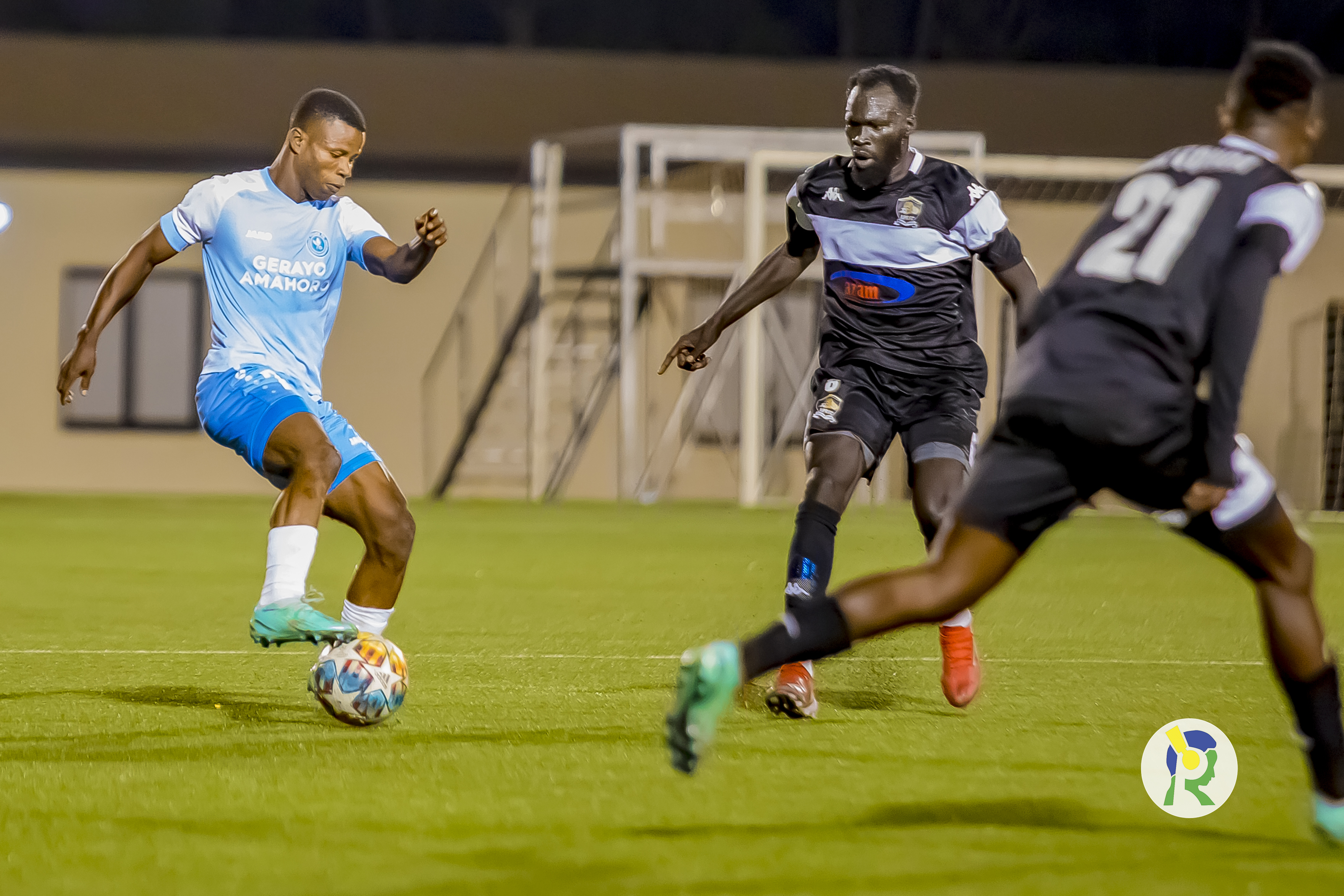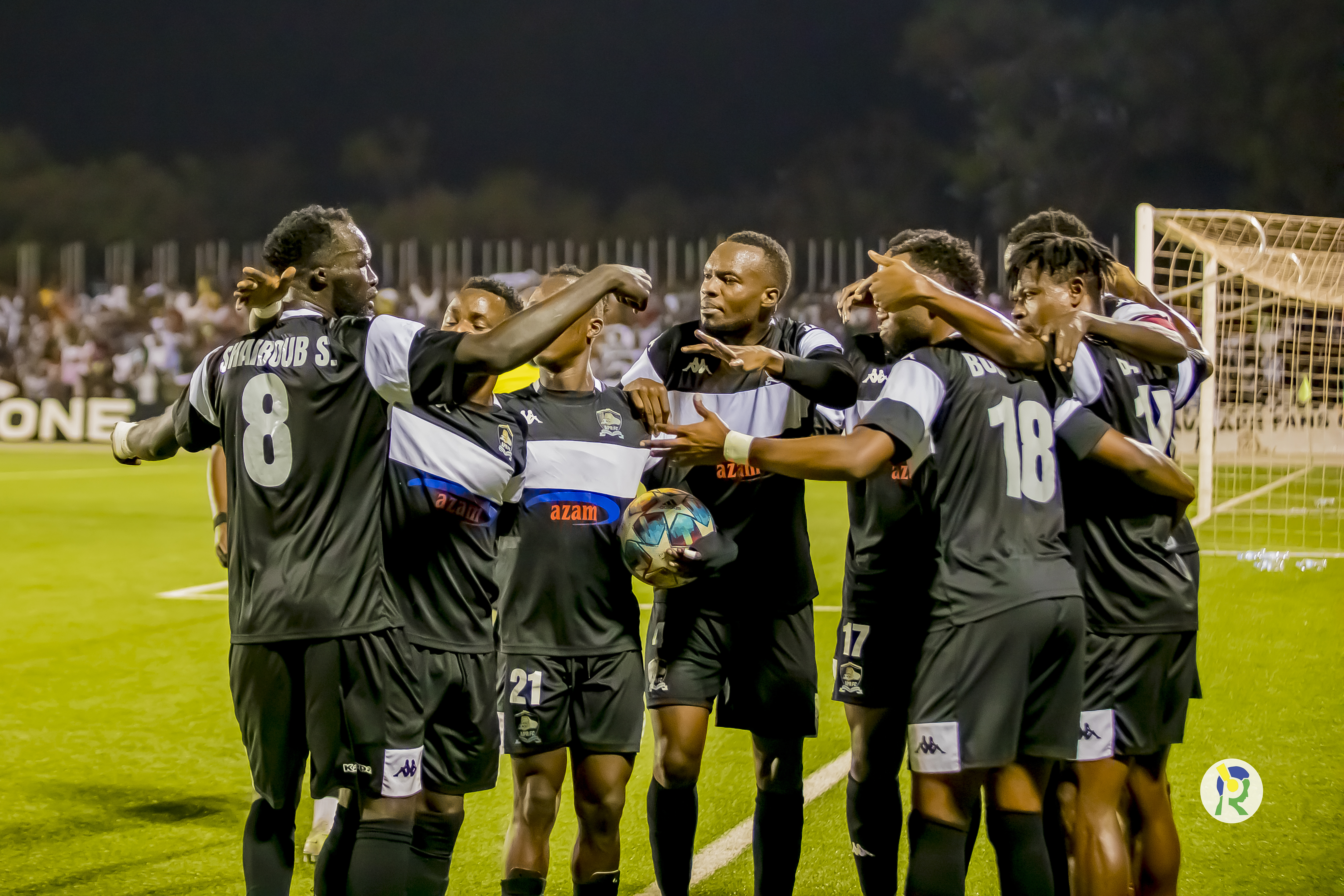 APR FC yambaye imyenda igizwe n'amabara yayo, amakabutura y'umukara n'imipira y'umukara irimo utubara tw'umweru.