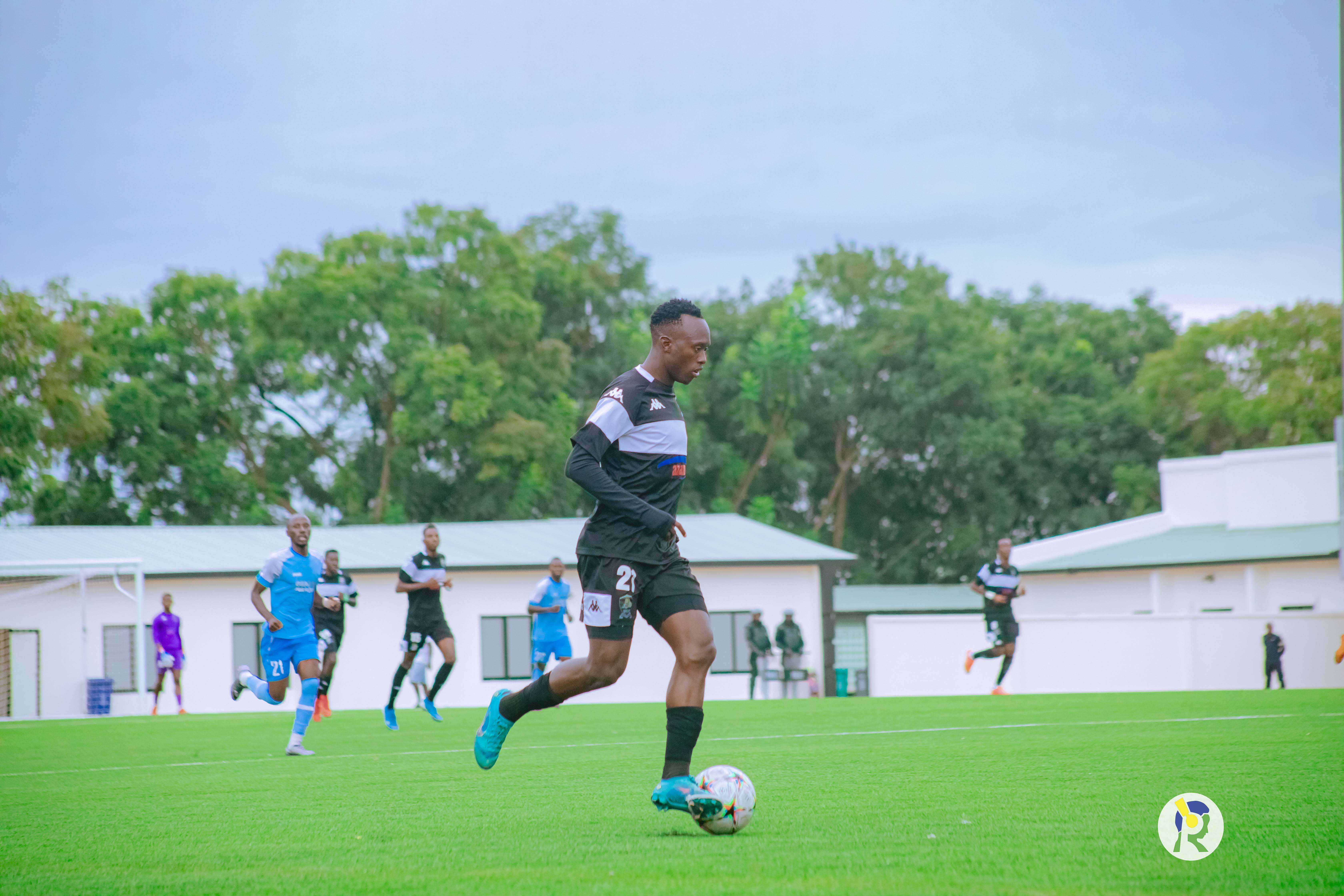 06" Mugisha Didier wa Police FC ahushije igitego ku mupira yari ahawe na Rutanga Eric ariko ashatse gushota umupira ukupita kuri Rwabuhihi ujya hanze