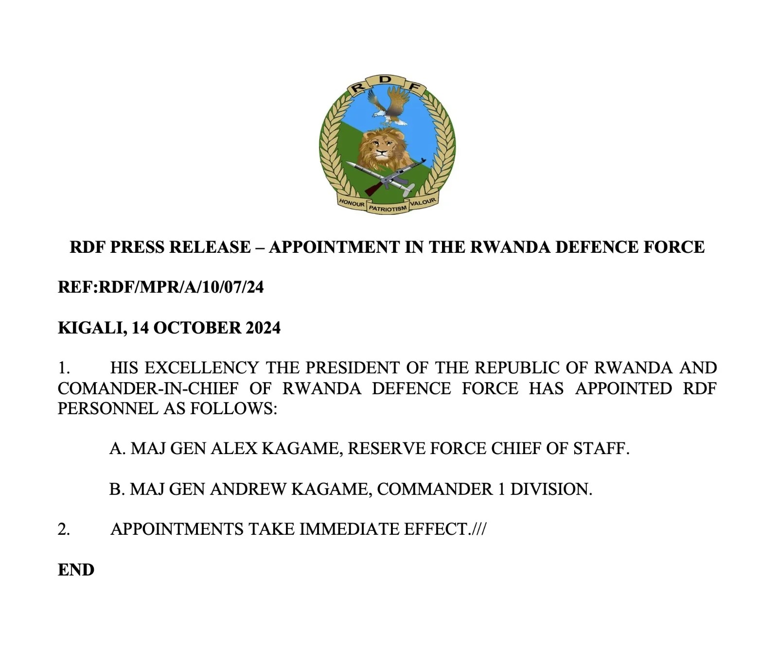 Maj. Gen. Andrew Kagame wagizwe Umuyobozi wa Diviziyo ya mbere ikorera mu Mujyi wa Kigali no mu Ntara y’Iburasirazuba yari asanzwe ari Umugaba Mukuru wungirije w’Inkeragutabara akaba asimbuye Maj. Gen Emmy Ruvusha uherutse kugirwa umuhuzabikorwa w’ibikorwa by’inzego z’umutekano z’u Rwanda muri Mozambique.
