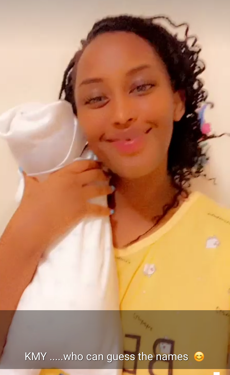 Miss Muyango kandi waciye amarenga y’amazina bise umwana wabo, yanditse amagambo atatu arimo KMY, maze abaza abakunzi be uri bumenye amazina y’umwana wabo.