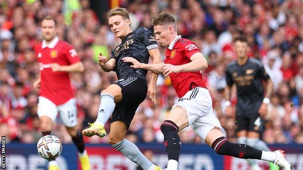 Manchester United: De Gea, Dalot, Varane, Martinez, Malacia, McTominay, Eriksen, Antony, Bruno Fernandes, Sancho, Rashford.Arsenal: Ramsdale, White, Saliba, Gabriel, Zinchenko, Sambi Lokonga, Xhaka, Saka, Odegaard, Martinelli, Jesus.