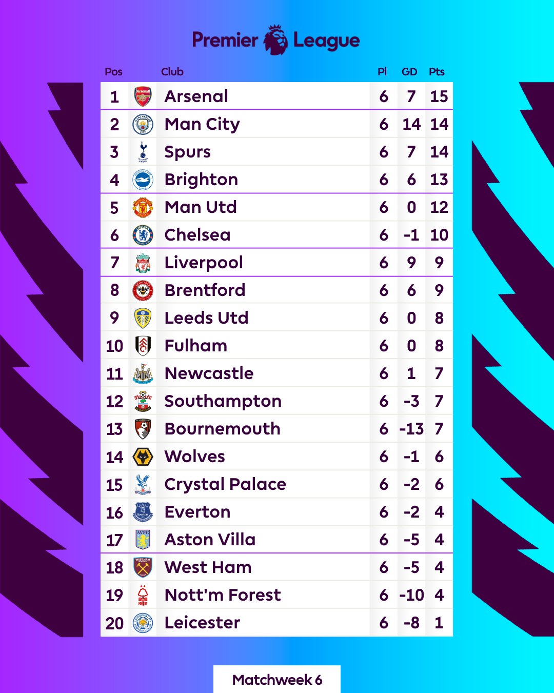 Arsenal iracyayoboye urutonde rwa shampiyona n'amanota 15, mu gihe Manchester United igeze ku mwanya wa 5 n'amanota 12 irushwa inota rimwe na Manchester City ya kabiri, Arsenal ikayirusha amanota 2.