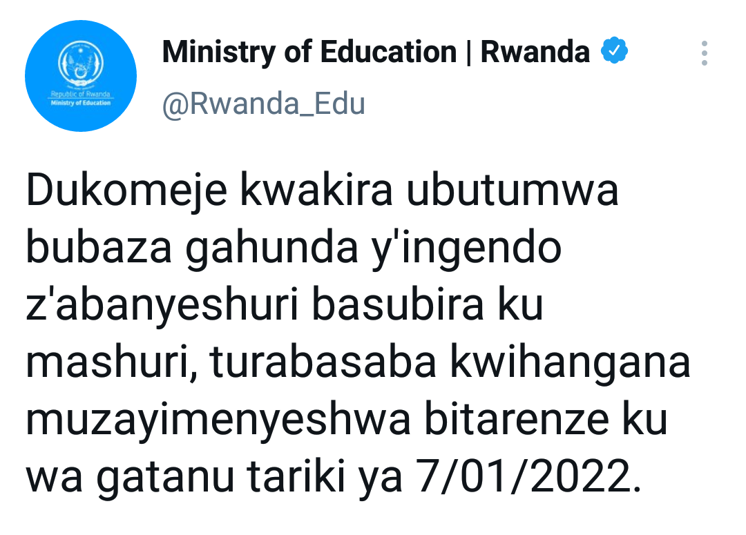 Nyuma y’aho bamwe bibazaga igihe amashuri azafungurira, bigahurirana n’uko bamwe bari bafite amakuru avuga ko hashobora kuba hongereweho ikindi cyumweru kungengebihe igaragaza igihe amashuri azafungurira,