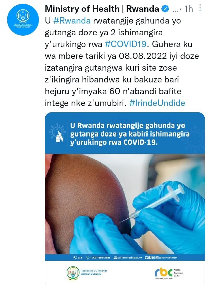 Iri tangazo riragira riti: "U Rwanda rwatangiye gahunda yo gutanga doze ya 2 ishimangira y’urukingo rwa Covi-19. Guhera ku wa Mbere tariki 08.08.2022. Iyi doze izatangira gutangwa kuri site zose z’ikingira hibandwa ku bakuze bari hejuru y’imyaka 60 n’abandi bafite intege nke z’umubiri ".