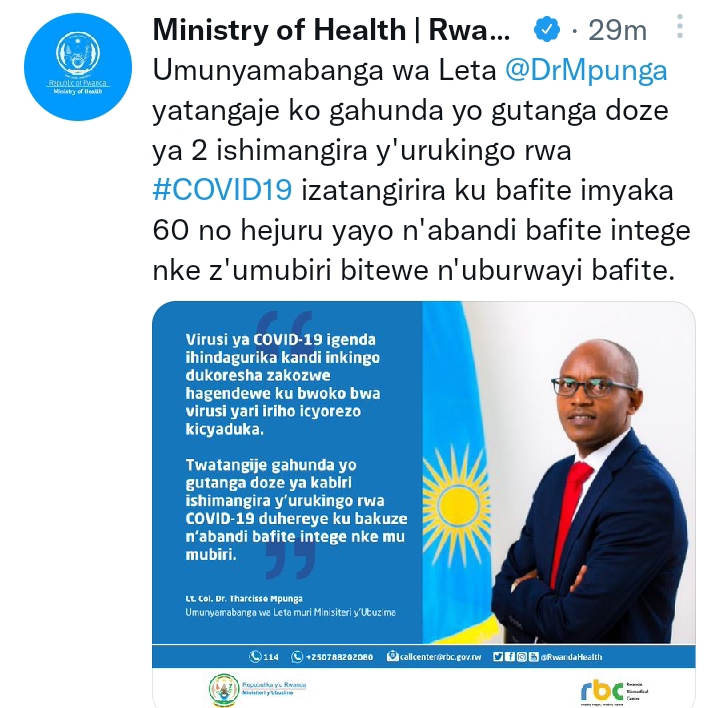 Mu itangazo rya nyujijwe kuri Twitter ya Minisiteri y’Ubuzima rigaragaza ko hagiye gurangira gutangwa Doze ya 2 ishimangira y'urukingo rwa Coronavirus. Yavuze ko izarutanga haherewe ku bafite imyaka 60 n’abandi bafite intege nke z’umubiri bitewe n’uburwayi bafite nk’uko byatangajwe n’Umunyamabanga wa Leta muri Minisiteri y'Ubuzima, Lt. Col. Dr Tharcisse Mpunga.