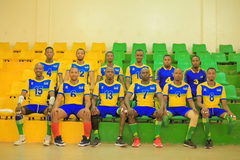 Minisitiri Aurore yafashe ifoto y'urwibutso ari kumwe n'ikipe y'igihugu ya Sitting Volleyball y'abagabo