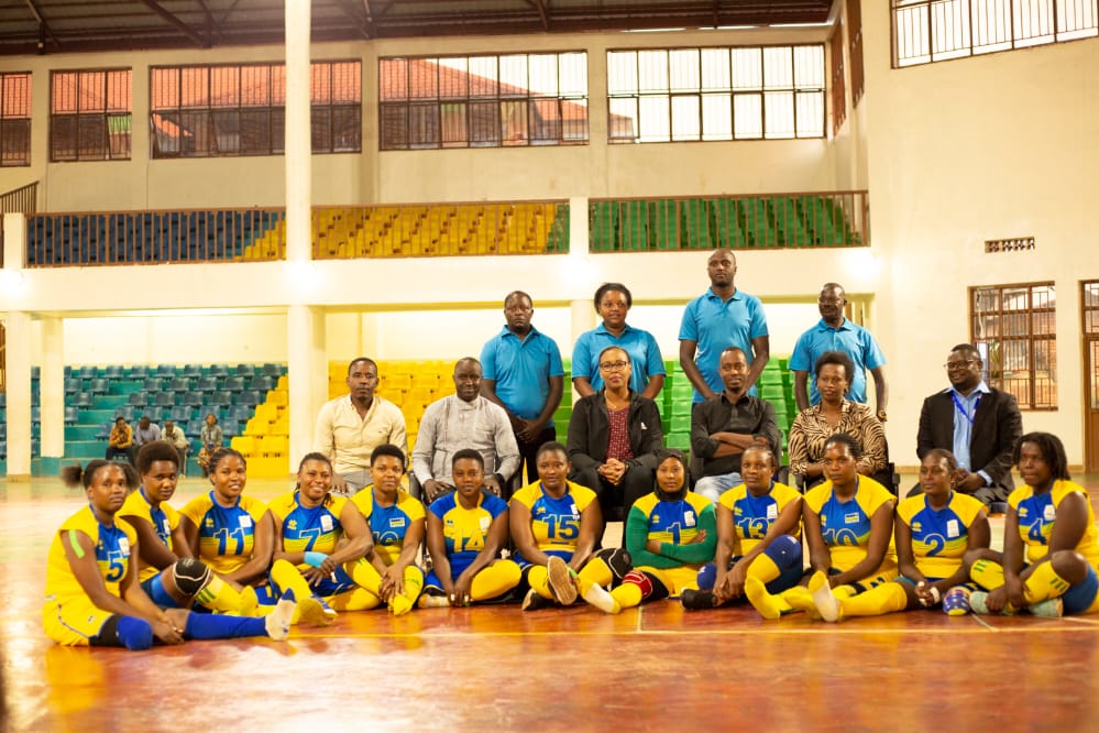 Minisitiri yafashe ifoto y'urwibutso ari kumwe n’abakinnyi b'ikipe y'igihugu ya Sitting Volleyball y'abagore