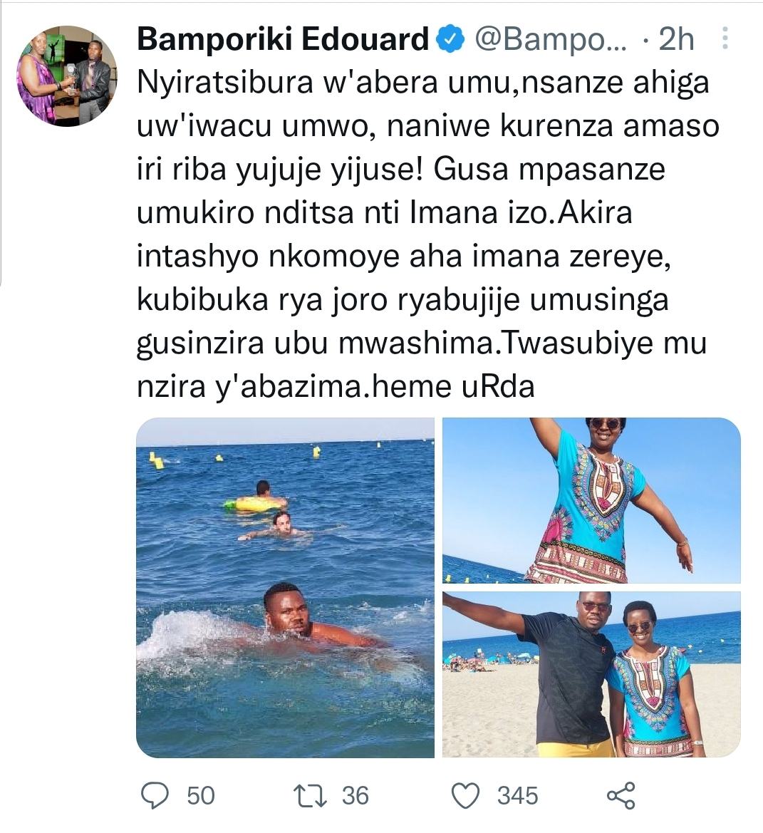 Mu minota micye ishize, Minisitiri Edouard Bamporiki yifashishije urukuta rwe rwa Twitter rukurikirwa n'abarenga ibihumbi 84 asangiza abamukurikira amafoto atatu amugaragaza ari kumwe n'umugore we bari i bwotamasimbi ku mazi ndetse hari n'ifoto imugaragaza ari mu mazi mo hagati bikagaragaza ko ari umuhanga mu koga na cyane ko nta n'akajiri abantu bogana yari yambaye - gafasha abantu kudacubira. Munsi y'ayo mafoto yanditseho amagambo ari mu Kinyarwanda kizimije nk'uko abimenyereweho.
