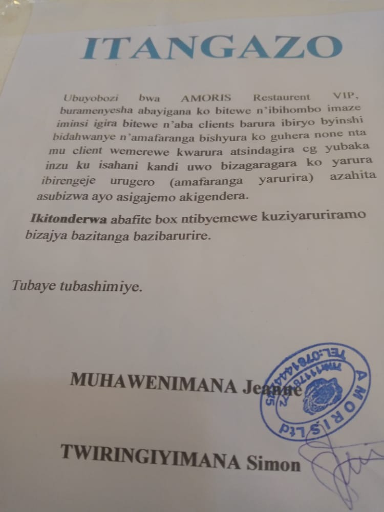 Bati “Ubuyobozi bwa Amoris Restaurant VIP, buramenyesha abayigana ko bitewe n'ibihombo imaze iminsi igira bitewe n'aba Clients barura ibiryo byinshi bidahwanye n'amafaranga bishyura ko guhera none nta mu client wemerewe kwarura atsindagira cyangwa yubaka inzu ku isahani kandi uwo bizagaragaraho ko yarura ibirengeje urugero, azahita asubizwa ayo asigajemo akigendera."