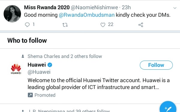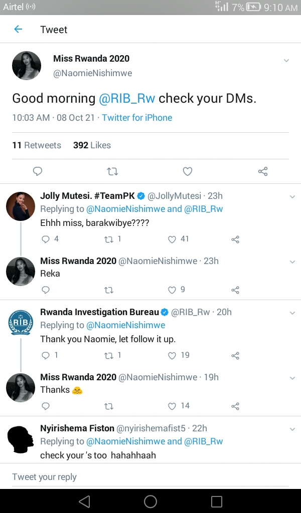 Nishimwe Naomi yagize ati: "Mwaramutse RIB, mwareba ubutumwa nabandikiye mu gikari". RIB yahise imuzubiza byihuse iti "Urakoze Naomie reka tubikurikirane". Miss Naomi yahise abashimira ati "Murakoze". Ubu butumwa bwa Nishimwe Naomie yabuhaye n'Urwego rw'Umuvunyi, uru rwego rwamusubije rugira ruti: "Muraho Miss, ubutubwa bwawe bwakiriwe murakoze".