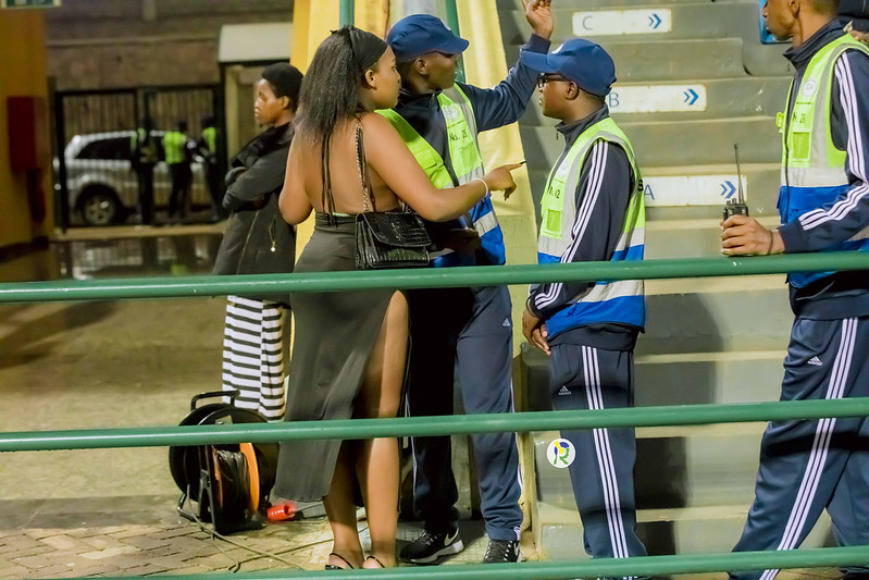 Umuzamu wa Rayon Sports, Hakizimana Adolphe na myugariro wa APR FC Nshimiyimana Yunnusu bicaye mu bafana