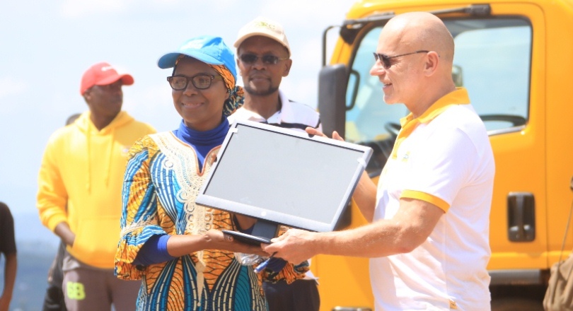 Mudasobwa, aho umuyobozi wa MTN Rwanda yashyikirije mudasobwa umuyobozi wa UNHCR, nawe